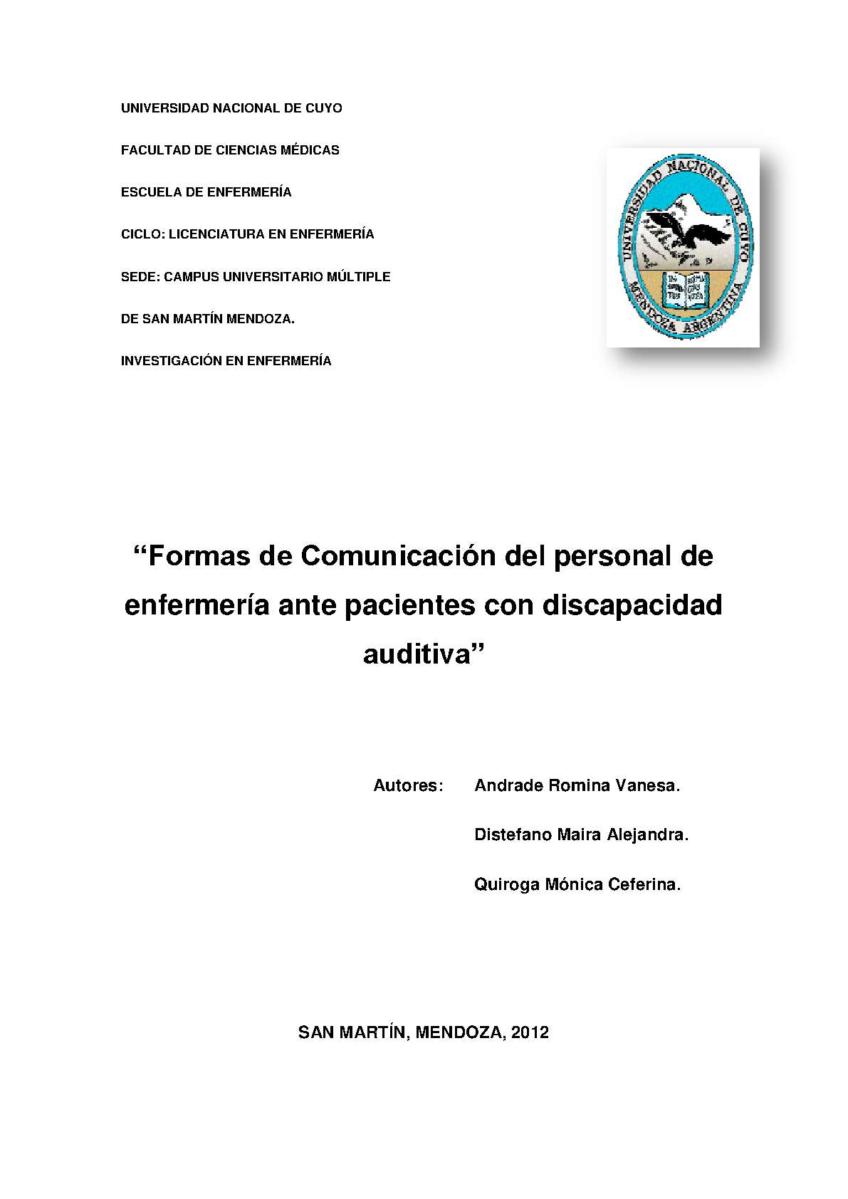El ser humano es sociable por naturaleza, la comunicación con sus pares es muy importante, ésta se lleva a cabo a través del lenguaje verbal y no verbal. El personal de enfermería se capacita en distintas áreas, realiza cursos y aprende idiomas, con el fin de obtener mayores conocimientos y brindar un mejor servicio a la población, pero muy pocos se capacita para mejorar la atención de enfermería hacia personas con capacidades diferentes. El proceso de la comunicación siendo tan fundamental a veces se ve impedido cuando se trata con personas con discapacidad auditiva, es importante tener en cuenta que estas personas también se enferman y por lo tanto requieren atención de salud. El problema surge cuando llega a la guardia del hospital un paciente con discapacidad auditiva y no viene acompañado de un intérprete, quien pueda servir de nexo para poder comprenderlo, es muy difícil lograr una comunicación en la forma correcta. Es necesario que los miembros del equipo de salud posean conocimiento básico para lograr entender al no oyente. Enfermería juega un papel fundamental en la promoción del acceso a los servicios de salud, pero se enfrentan a barreras lingüísticas y culturales, por lo que se pone en juego las estrategias de enfermería para facilitar y mejorar el acceso de la comunidad de personas con discapacidad a los servicios de salud. El propósito de este trabajo de investigación es determinar cuáles son las formas de comunicación que adopta el personal de enfermería en los servicios de Guardia y Unidad de Terapia Intensiva del Hospital Alfredo Ítalo Perrupato, del departamento de San Martín, Provincia de Mendoza, para abordar a pacientes con discapacidad auditiva en el primer semestre del año 2012.