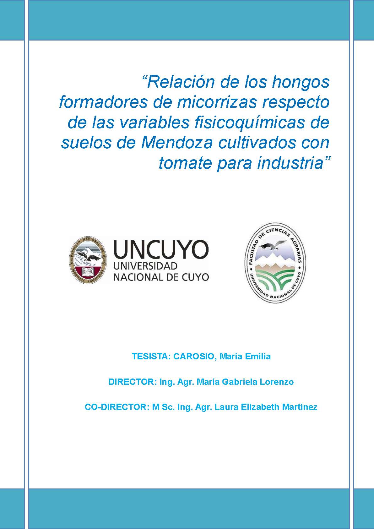 Carosio, María Emilia. (2017). Relación de los hongos formadores de micorrizas respecto de las variables fisicoquímicas de suelos de Mendoza cultivados con tomate para industria: (Tesina de grado). Mendoza, Universidad Nacional de Cuyo. Facultad de Ciencias Agrarias .