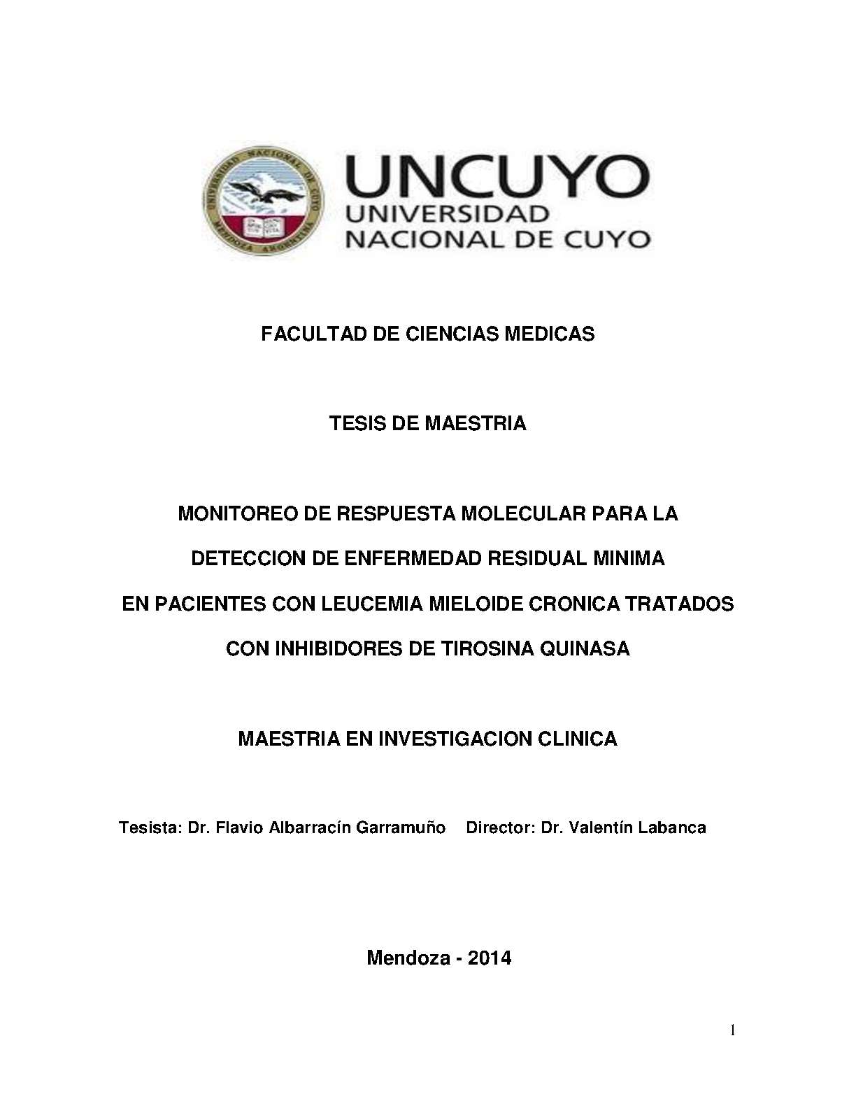 INVESTIGACIÓN BIOMÉDICA - LEUCEMIA MIELÓGENA CRÓNICA BCR-ABL POSITIVA - LEUCEMIA MIELOIDE - NEOPLASIAS HEMATOLÓGICAS - PROTEÍNAS TIROSINA QUINASAS/ ANTAGONISTAS & INHIBIDORES - NEOPLACIAS RESIDUALES - MONITOREO INMUNOLÓGICO - INMUNOTERAPIA - UNIVERSIDAD NACIONAL DE CUYO. FACULTAD DE CIENCIAS MÉDICAS