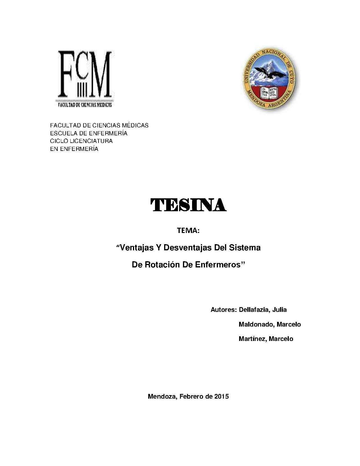 El presente trabajo se ha realizado teniendo en cuenta las situaciones que se plantean con el sistema de rotación en los servicios de enfermería en relación al nivel de satisfacción del personal, sus ventajas y desventajas. Se utilizó como universo el total de enfermeros del Hospital J.N. Lencinas. Se realizo un estudio de tipo cuali-cuantitativo, descriptivo transversal. Los datos fueron obtenidos a través de encuesta personal y anónima. Y se proceso a través de planilla Excel. Dentro del Marco teórico se utilizaron las distintas teorías del placer y el displacer, las distintas teorías motivacionales, y los tipos de rotación que se utilizan en los servicios de salud, buscando explicar las motivaciones del ser humano, y su relación con el entorno laboral, Intentando establecer, como el sistema de rotación hospitalaria, repercuten en la vida social, familiar y laboral del personal de enfermería. Buscando que el presente trabajo sirva de referencia para posteriores estudios que involucren la rotación de servicio dentro de la problemática laboral del personal de enfermería.