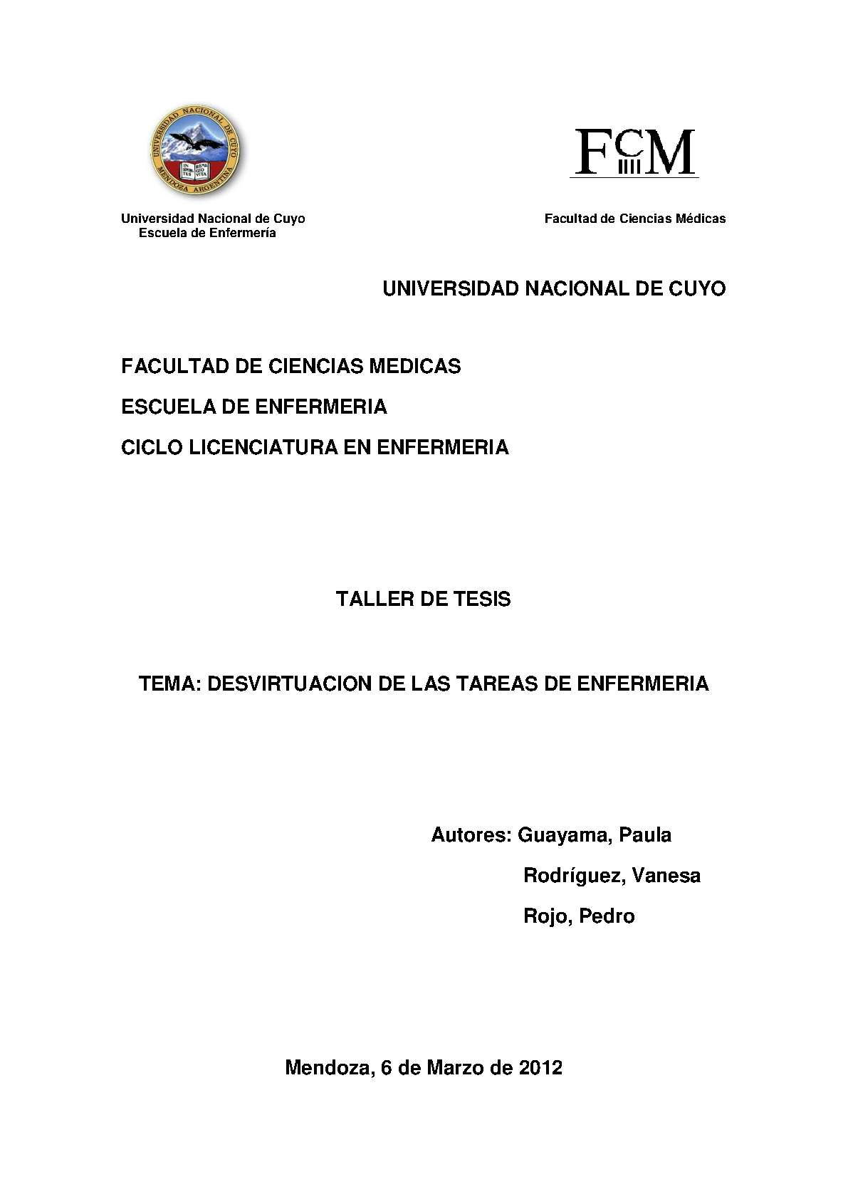 Guayama, Paula ; Rodríguez, Vanesa; Rojo, Pedro. (2013). Desvirtuación de las tareas de enfermería : (Tesina de grado). Mendoza, Universidad Nacional de Cuyo. Facultad de Ciencias Médicas. Escuela de Enfermería..