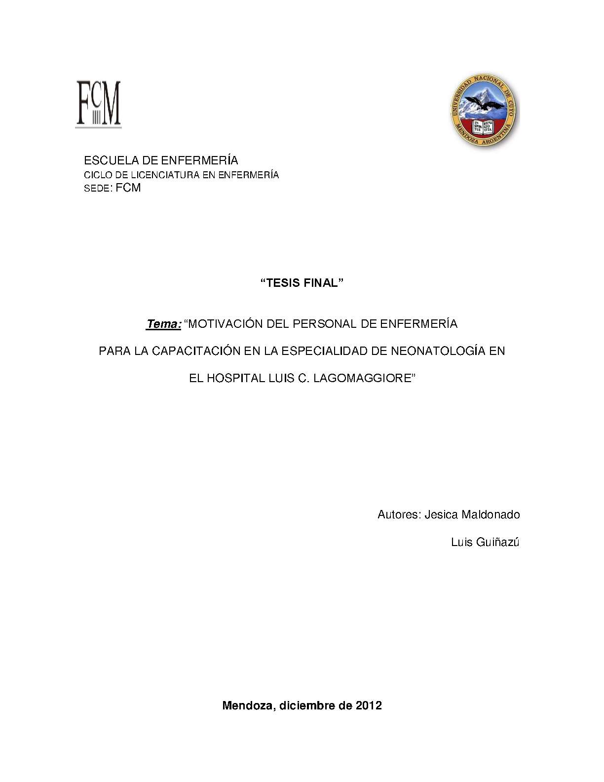 El rol de los enfermeros es totalmente primordial en la atención de los recién nacidos; ya que ésos son pacientes que se expresan corporalmente. Es así que mediante los cuidados permanentes se logra la identificación de alteraciones; la observación detallada de los cambios y situaciones alarmantes; siendo estas observaciones complemento de la tecnología, y el medio de comunicación entre el recién nacido y el enfermero. La administración de los medicamentos también necesita de una observación clara y detallada. La capacitación del nuevo personal de enfermería, es sin duda fundamental para el éxito en la atención del recién nacido. Lo imprescindible es la capacitación como herramienta, lo que conlleva a la actualización y el desarrollo de la profesión. Por lo tanto se debe asegurar que el personal logre la actualización de sus conocimientos; pero muchas veces por falta de incentivo del personal de enfermería, además de otros factores; esta capacitación no llega a realizase. Este trabajo de investigación tiene como objetivo conocer cuál es el grado de motivación del personal de neonatología del Hospital Luis Carlos Lagomaggiore para su capacitación en esta área, durante el segundo semestre del año 2012, en Mendoza y determinar la existencia de factores que interfieren en la motivación para dicha capacitación.