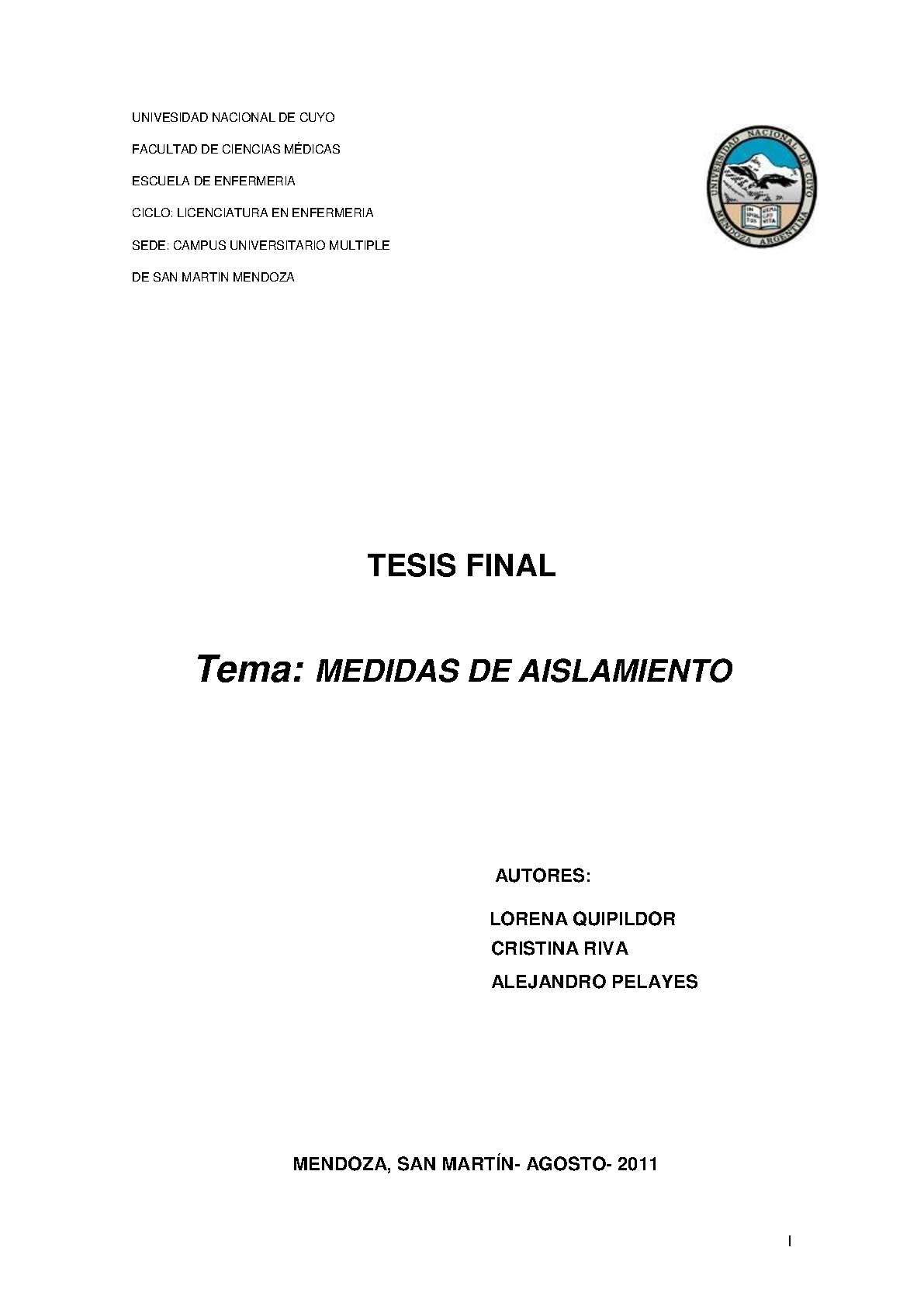El aislamiento es una medida o barrera diseñada especialmente para evitar que se transmitan o propaguen cierto tipo de enfermedades. Es un conjunto de medidas destinadas, a prevenir y controlar el riesgo de infección o transmisión de microorganismos, tanto a pacientes, como al personal de salud, a través de barreras que interrumpan la cadena de transmisión de las infecciones. El personal de enfermería en su tarea cotidiana trabaja con pacientes en aislamientos por lo que debe utilizar las medidas de bioseguridad. En la actualidad el cumplimiento de las normas de bioseguridad están mundialmente protocolizadas de manera de proteger la salud del trabajador, las conductas individuales de algunos agentes de salud pone en riesgo la salud colectiva de sus colegas y del paciente que atiende que es el objetivo final del profesional de enfermería. Este trabajo de investigación tiene como objetivo determinar qué factores intervienen, para que los enfermeros no ejecuten correctamente las medidas de aislamiento, del sector de Clínica Médica: A, B, C, D, del Hospital del Carmen, Godoy Cruz, Mendoza, durante los meses de octubre a diciembre 2010.