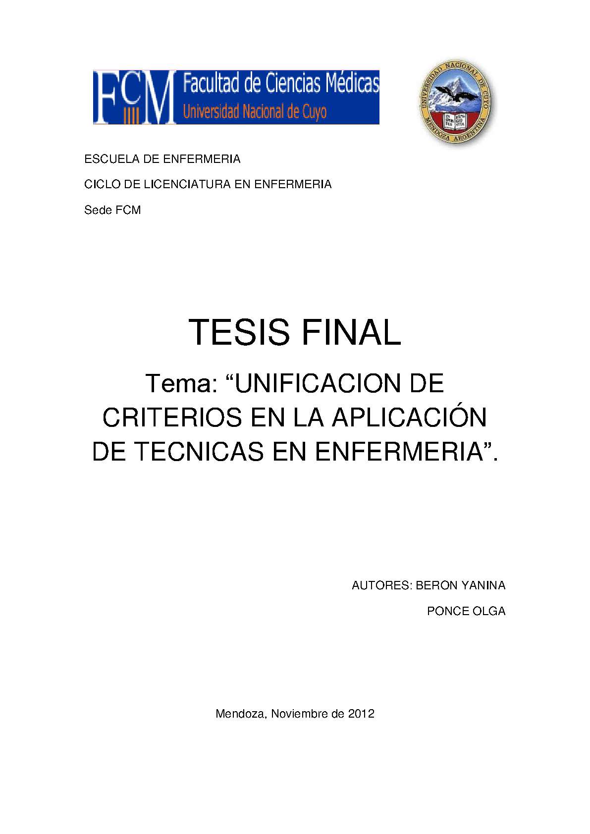 Berón, Yanina; Ponce, Olga. (2013). Unificación de criteros en la aplicación de técnicas en enfermería: (Tesina de grado). Mendoza, Universidad Nacional de Cuyo. Facultad de Ciencias Médicas. Escuela de Enfermería..