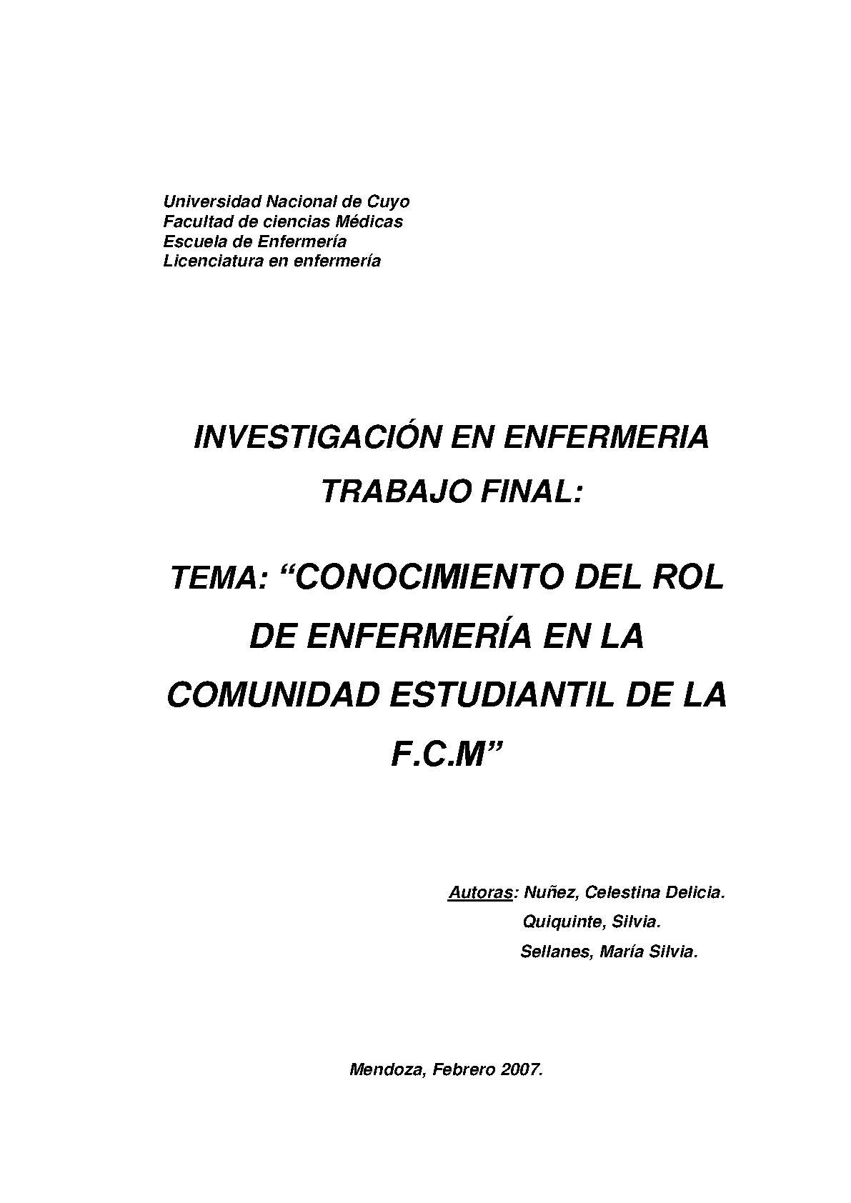 Nuñez, Celestina Delicia; Quiquinte, Silvia; Sellanes, María Silvia. (2007). Conocimiento del rol de enfermería en la comunidad estudiantil de la FCM: (Tesina de grado). Mendoza, Universidad Nacional de Cuyo. Facultad de Ciencias Médicas. Escuela de Enfermería..