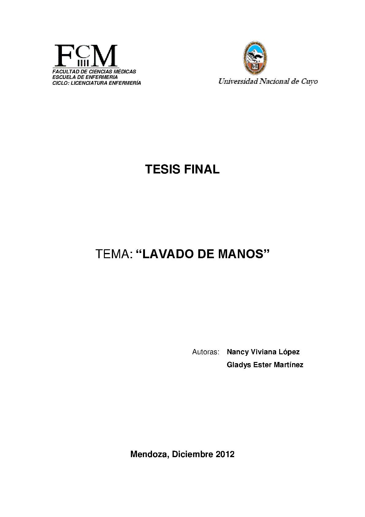 La higiene hospitalaria es uno de los aspectos fundamentales, en el control de infecciones. El medio ambiente hospitalario cumple un rol importante, en la trasmisión de enfermedades y se ha podido relacionar, en algunas oportunidades, como causa directa de infecciones en los pacientes y ha sido responsable de grandes brotes epidémicos. Las infecciones nosocomiales (IN) ocasionan en el mundo 1.400 muertos cada día y constituyen las complicaciones intrahospitalarias más frecuentes. Las manos de los trabajadores del equipo de salud son un vehículo muy importante para la trasmisión de microorganismos multi resistente y de infecciones hospitalarias. Las IN de pacientes causadas por las manos contaminadas del personal de la salud es una de las formas de diseminación de los agentes infecciosos más comunes. La higiene de las manos del personal en los centros de salud, es el procedimiento aséptico más importante en la prevención y control de enfermedades infecciosas. Es por eso que se debe considerar que todo lo que rodea al paciente debe gozar de una exhaustiva higiene para prevenir infecciones como principio fundamental. Este trabajo de investigación tiene como objetivo determinar cuál es el grado de cumplimiento del lavado de manos del personal de Hemodinamia del Hospital Central de Mendoza, en el trimestre que abarca marzo a mayo de 2012.