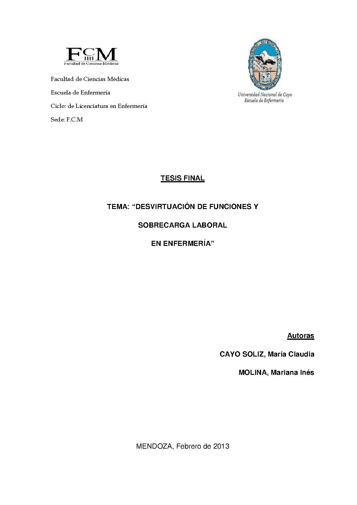Cayo Solíz, María Claudia; Molina, Mariana Inés. (2013). Desvirtuación de funciones y sobrecarga laboral en enfermería: (Tesina de grado). Mendoza, Universidad Nacional de Cuyo. Facultad de Ciencias Médicas. Escuela de Enfermería..