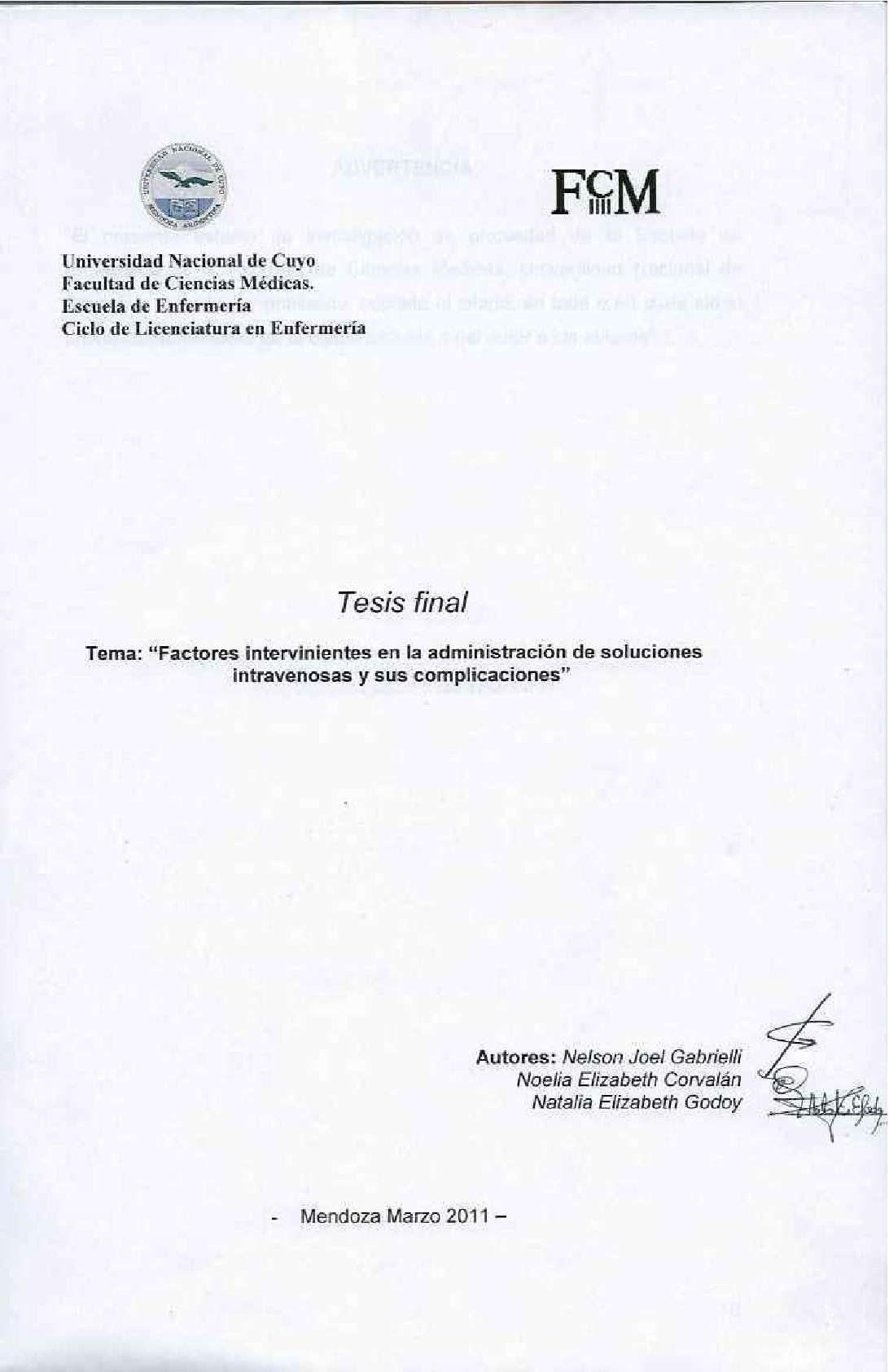 Una infusión intravenosa (IV) es la instalación en una vena de un fluido y, ocasionalmente de electrolitos o sustancias nutritivas, se administran a personas hospitalizadas; que requieren un aporte extraordinario de fluidos, o que bien no pueden ingerir por sus propios medios líquidos y alimentos en la forma oral o por vía enteral. El médico es el responsable de indicar el tipo de solución que ha de ser infundida, el volumen a administrar y la velocidad a la que debe ser ingresado en el torrente sanguíneo de las personas con terapia intravenosa. En la actualidad la infusión intravenosa es un campo técnico y especializado en donde enfermería cumple un rol importante y destacado, con un alto grado de responsabilidad. La mayoría de las personas hospitalizadas ha recibido esta terapéutica con gran aceptación, pero desde hace un tiempo, se puede observar que vienen apareciendo complicaciones relacionadas a la administración de estas soluciones, donde un gran porcentaje de los familiares, sin conocimientos científicos, al ver los goteos mínimos aumentan la velocidad de infusión de las soluciones administradas. Las complicaciones que aparecen pueden ser locales o sistémicas, como lo son la extravasación, flebitis, equimosis, hematomas, sobrehidratación o sobrecarga de volumen, disnea, edemas, edema pulmonar, etc. El profesional de enfermería, antes de actuar debe tener en cuenta ciertos aspectos que hacen a la administración de soluciones intravenosas con el fin de minimizar sus potenciales complicaciones como son: duración del tratamiento; tipo de solución intravenosa prescripta, tamaño del catéter intravenoso que vamos a utilizar; permeabilidad y flexibilidad de la vía; y edad del paciente. Y una vez instaurada la infusión, el personal de enfermería debe controlar que la velocidad se cumpla, esto debe realizarse en forma periódica o utilizando dispositivos que regulen el flujo. Este trabajo de investigación tiene como objetivo determinar qué factores intervienen en la administración de soluciones intravenosas y sus complicaciones en pacientes internados en Clínica Médica A y B, Hospital del Carmen, Mendoza, de agosto a octubre 2010.