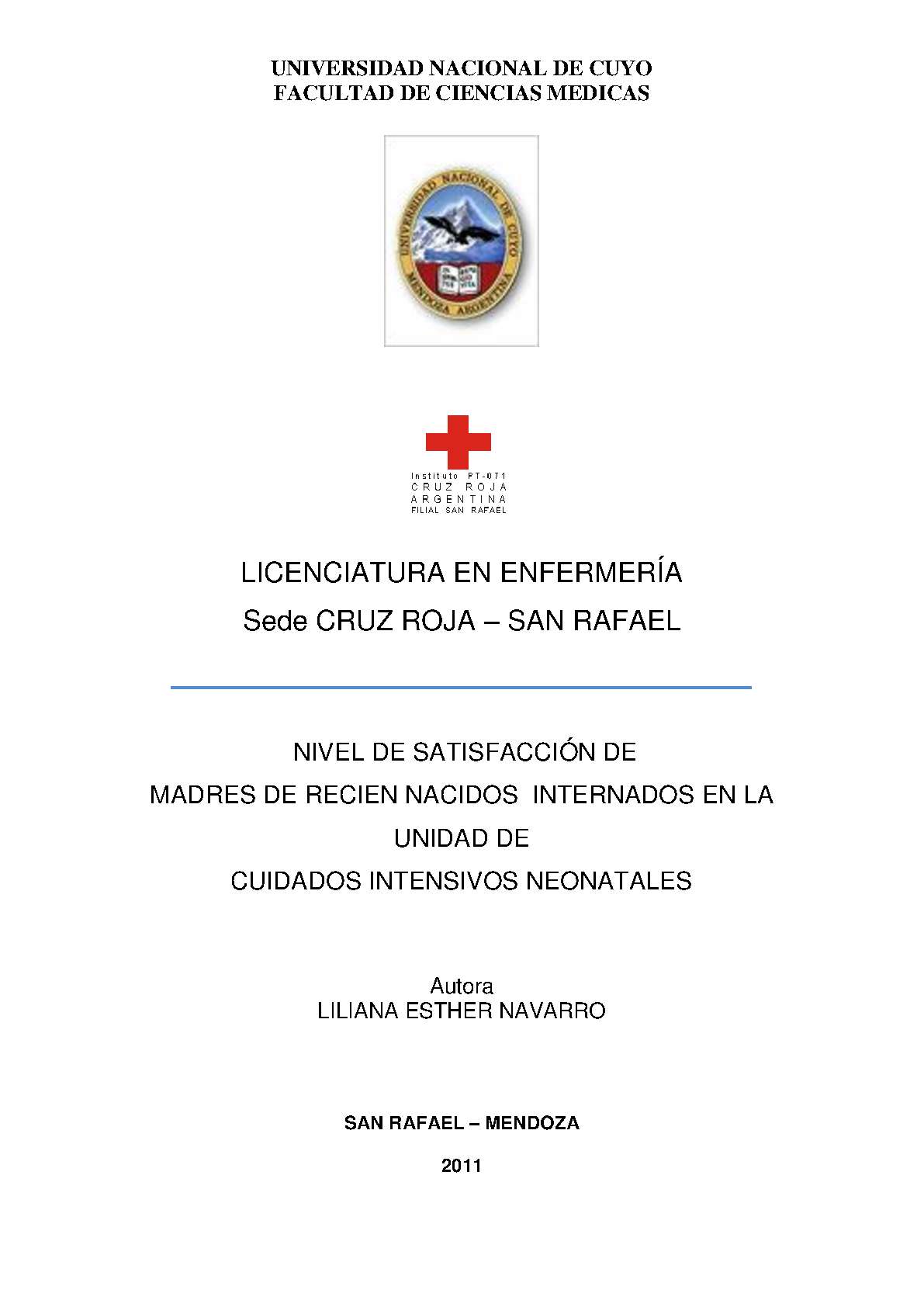Los avances en el cuidado de los recién nacidos prematuros ha significado un progreso notable en la neonatología moderna. Las unidades de cuidado intensivo neonatal (UCIN) cada vez más eficientes cumplen un papel importante en la disminución de la mortalidad neonatal e infantil. Sin embargo como era de esperar, estos resultados alentadores de las UCIN han provocado algunos efectos no deseados, en especial sobre los padres. La experiencia demuestra que la internación en la UCIN provoca reacciones diversas en los padres en general intensos y perturbadores. El estrés y la depresión de madres y padres son algunos de los aspectos más frecuentemente observados y que pueden llegar a interferir en la organización de la interacción entre ellos y su hijo, como así también en la comunicación con los profesionales que asisten al niño. Los profesionales del equipo de salud que diariamente desarrollan tareas en la UCIN, son testigos cotidianos no sólo del nacimiento de un niño en riesgo, sino del nacimiento de la relación temprana entre el niño y sus padres, en un contexto adverso y de riesgo psicosocial. En la UCIM. se encuentran personas que pueden brindar la ayuda que los padres y la familia del prematuro necesitan. Los miembros de la familia y los miembros del equipo de salud aliados, estos aliados son médicos, enfermeros, asistentes sociales, agentes de salud, técnicos, bioquímicos y voluntarios. Todos ellos están comprometidos en función del servicio y con fuerte vocación en el cuidado del recién nacido. Este trabajo de investigación tiene como objetivo determinar cuál es el grado de satisfacción de las madres de los recién nacidos internados en la Unidad de Cuidados Intensivos Neonatales, del Hospital Teodoro Schestakow, San Rafael, Mendoza, respecto a la atención recibida por parte del personal del equipo de salud, durante los meses de agosto a octubre del año 2010.