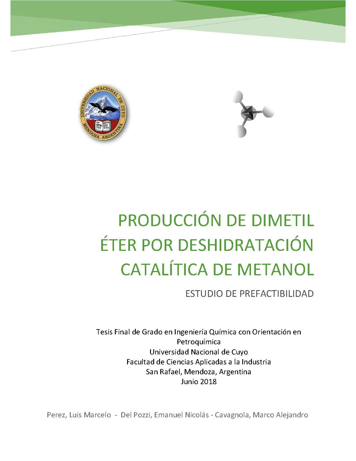 Perez, Luis Marcelo; Cavagnola,Marco Alejandro; Del Pozi, Emanuel Nicolás. (2018). Producción de dimetil por deshidratación catalítica de metanol: estudio de prefactibilidad (Trabajo final de grado). Mendoza, Universidad Nacional de Cuyo. Facultad de Ciencias Aplicadas a la Industria .