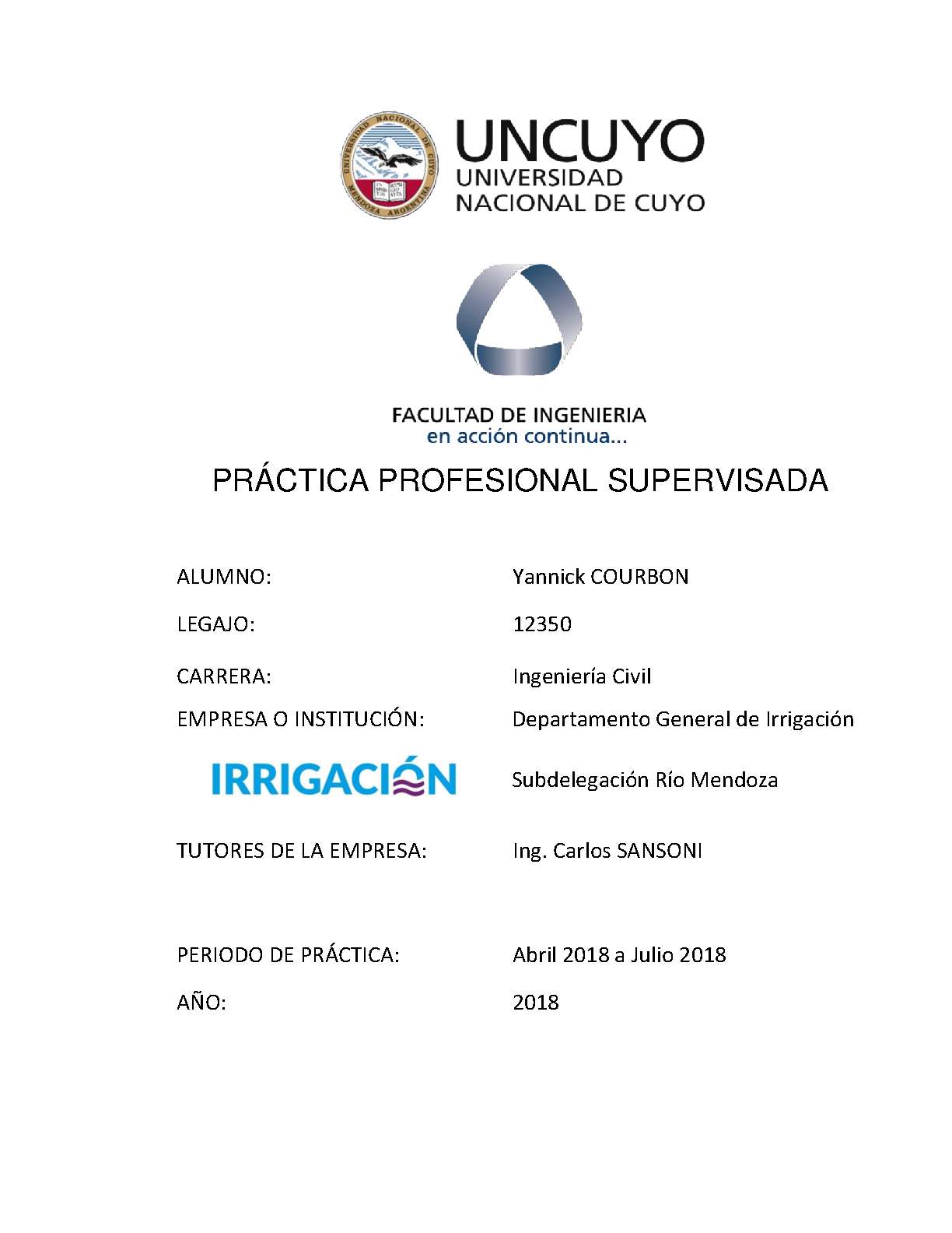 La experiencia laboral fue llevada a cabo en el Departamento General de Irrigación - Subdelegación Río Mendoza; durante el período comprendido entre los meses de abril y julio de 2018.