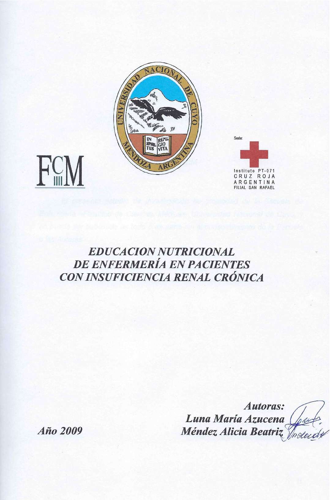 Luna, María Azucena; Méndez, Alicia Beatriz. (2009). Educación nutricional de enfermeros en pacientes con insuficiencia renal crónica : (Tesina de grado). Mendoza, Universidad Nacional de Cuyo. Facultad de Ciencias Médicas. Escuela de Enfermería..