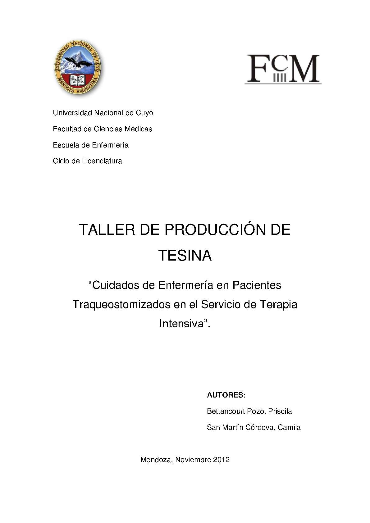 Bettancourt Pozo, Priscila; San Martín Córdova, Camila. (2012). Cuidados de enfermería en pacientes traqueostomizados en el servicio de terapia intensiva: (Tesina de grado). Mendoza, Universidad Nacional de Cuyo. Facultad de Ciencias Médicas. Escuela de Enfermería..