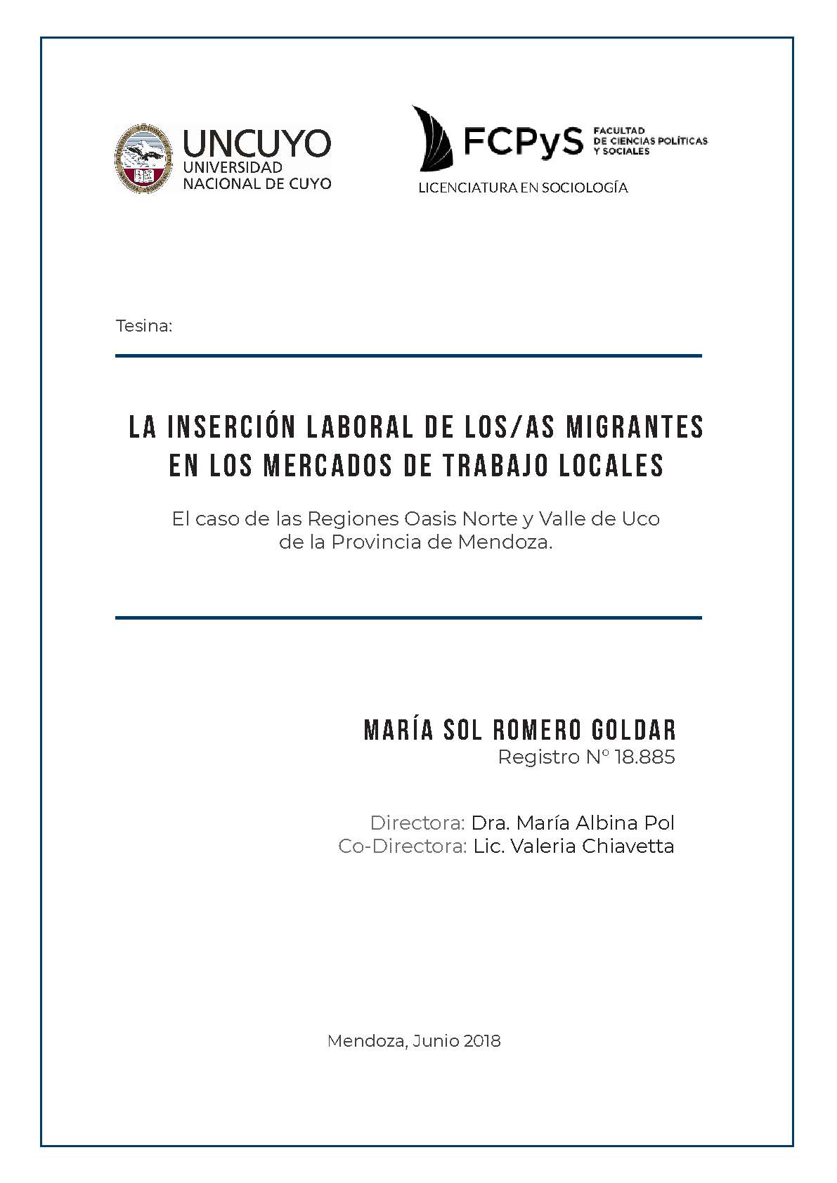 Romero Goldar, Sol. (2018). La inserción laboral de los/as migrantes en los mercados de trabajo locales: el caso de las regiones Oasis Norte y Valle de Uco de la Provincia de Mendoza (Tesina de grado). Mendoza, Universidad Nacional de Cuyo. Facultad de Ciencias Políticas y Sociales .