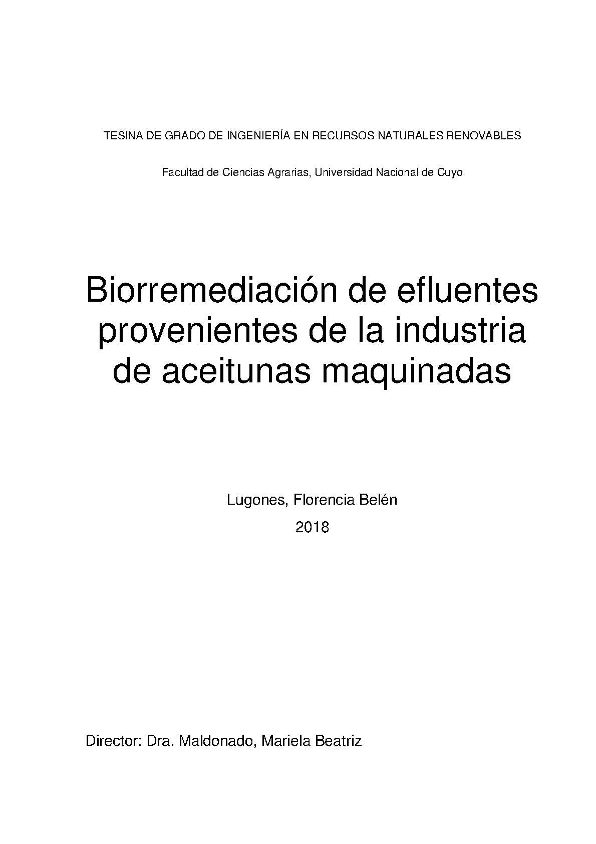 Lugones, Florencia Belén. (2018). Biorremediación de efluentes provenientes de la industria de aceitunas maquinadas: (Tesina de grado). Mendoza, Universidad Nacional de Cuyo. Facultad de Ciencias Agrarias .