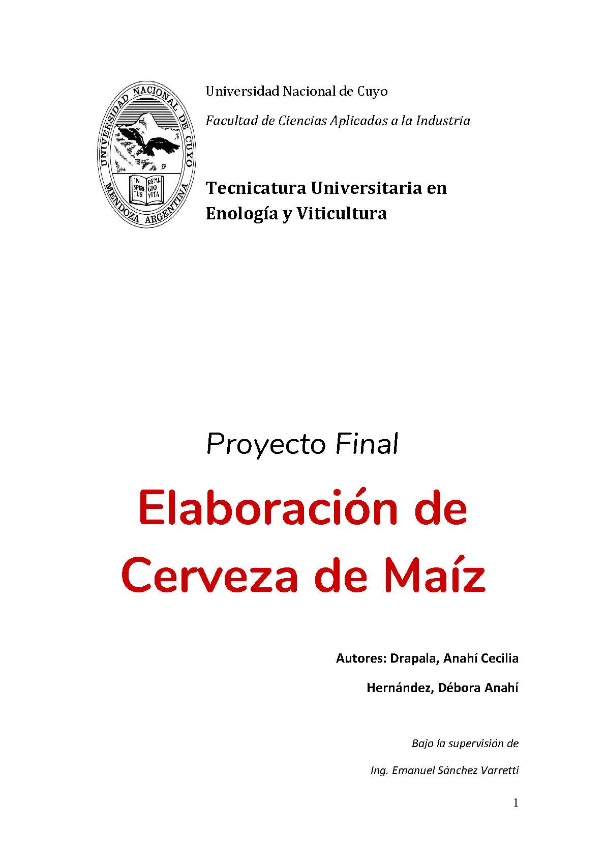 Drapala, Anahí Cecilia; Hernández, Débora Anahí. (2018). Elaboración de cerveza de maíz: (Proyecto final de pregrado). Mendoza, Universidad Nacional de Cuyo. Facultad de Ciencias Aplicadas a la Industria .