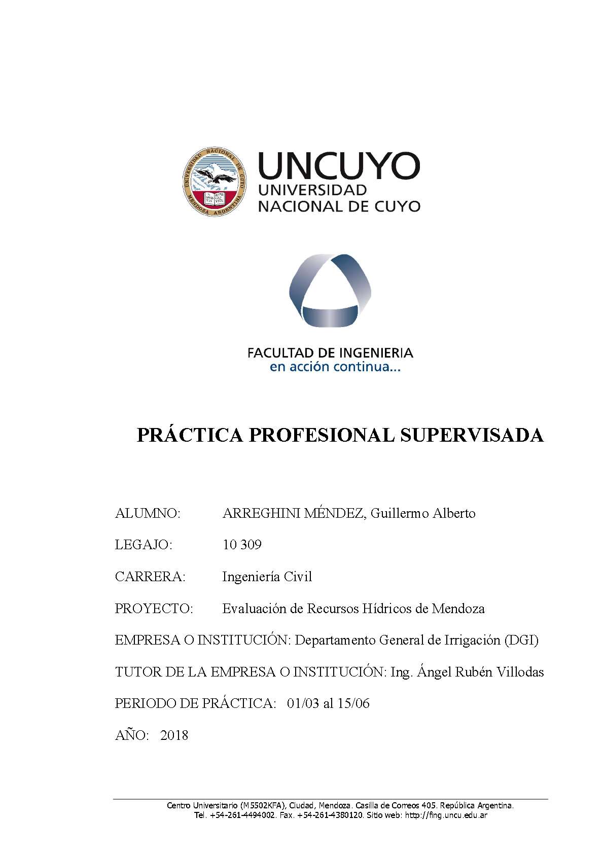 En el siguiente informe, se realiza una descripción de las actividades realizadas por uno de los alumnos de la Carrera de Ingeniería Civil, durante la realización de la Práctica Profesional Supervisada. Las mismas fueron realizadas en el Área de Hidrología del Departamento General de Irrigación (DGI).