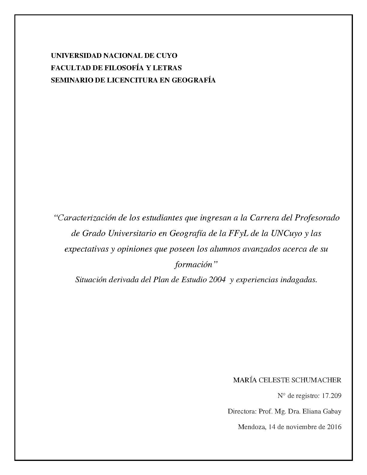 Schumacher, María Celeste. (2016). Caracterización de los estudiantes que ingresan a la carrera del Profesorado de Grado Universitario en Geografía de la FFyL de la UNCuyo y las expectativas y opiniones que poseen los alumnos avanzados acerca de su formación: situación derivada del Plan de Estudio 2004 y experiencias indagadas (Trabajo final de grado). Mendoza, Universidad Nacional de Cuyo. Facultad de Filosofía y Letras .