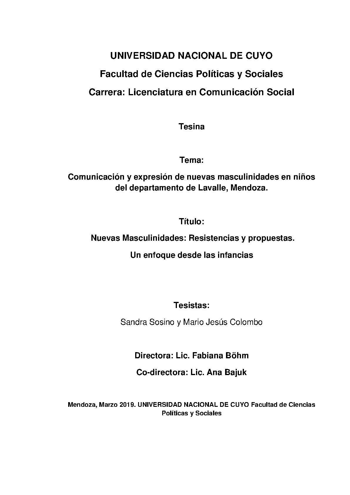 Colombo, Mario Jesús ; Sosino, Sandra Noemí . (2019). Nuevas masculinidades: resistencias y propuestas : un enfoque desde las infancias (Tesina de grado). Mendoza, Universidad Nacional de Cuyo. Facultad de Ciencias Políticas y Sociales .