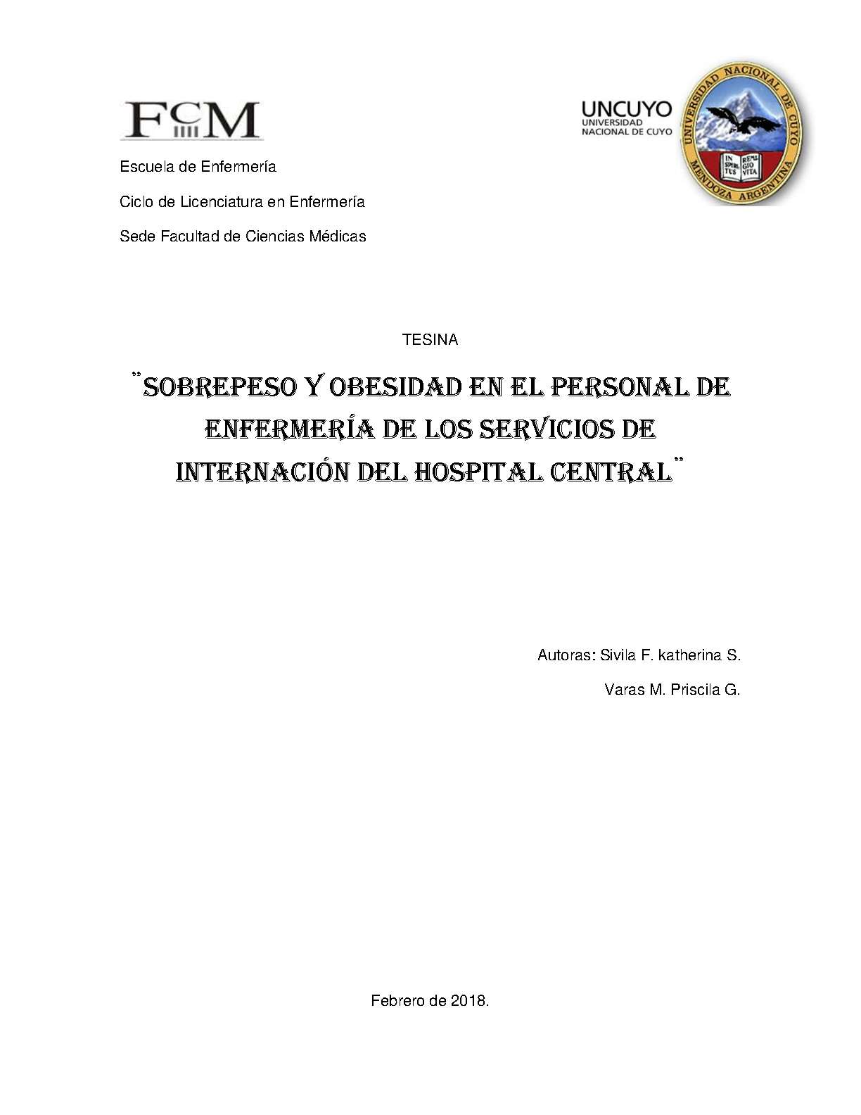Sivila F., Katherina S.; Varas M., Priscila G.. (2018). Sobrepeso y obesidad en el personal de enfermería de los servicios de internación del Hospital Central: (Tesina de grado). Mendoza, Universidad Nacional de Cuyo. Facultad de Ciencias Médicas. Escuela de Enfermería..