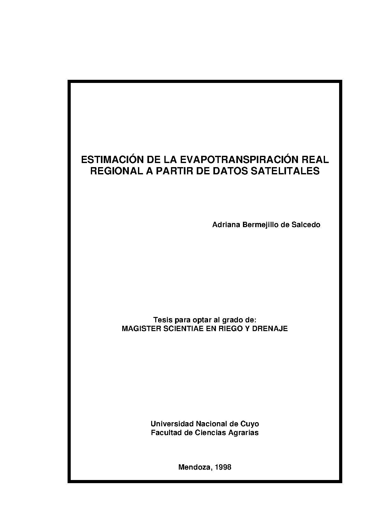 Bermejillo, Adriana. (1998). Estimación de la evapotranspiración real regional a partir de datos satelitales: (Tesis de Maestría). Mendoza, Universidad Nacional de Cuyo. Facultad de Ciencias Agrarias .