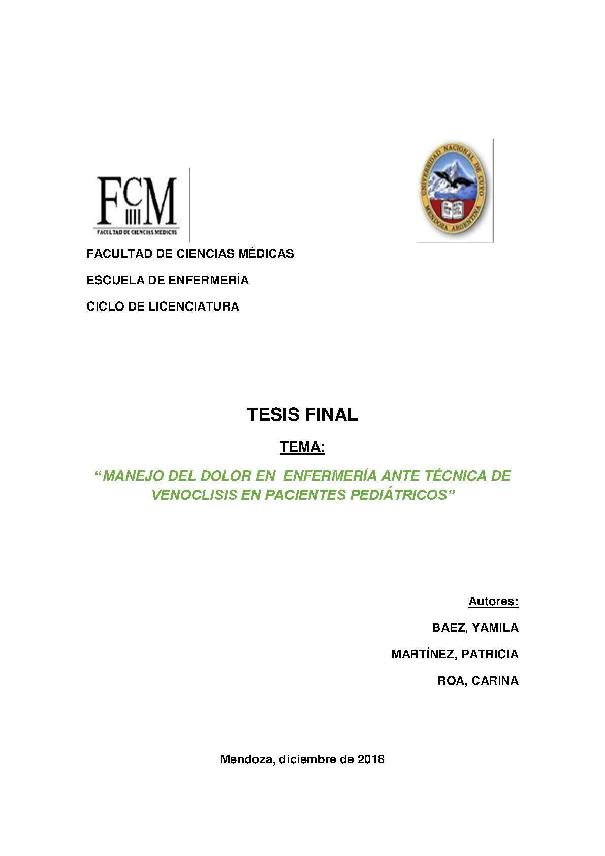 Báez, Yamila; Martínez, Patricia; Roa, Carina. (2018). Conocimiento de las enfermeras sobre el manejo del dolor en enfermería ante técnica de venoclisis : estudio descriptivo de corte transversal realizado en el servicio de pediatría 1 del Hospital Dr. Ramón Carrillo, Mendoza, durante octubre del 2018 (Tesina de grado). Mendoza, Universidad Nacional de Cuyo. Facultad de Ciencias Médicas. Escuela de Enfermería..