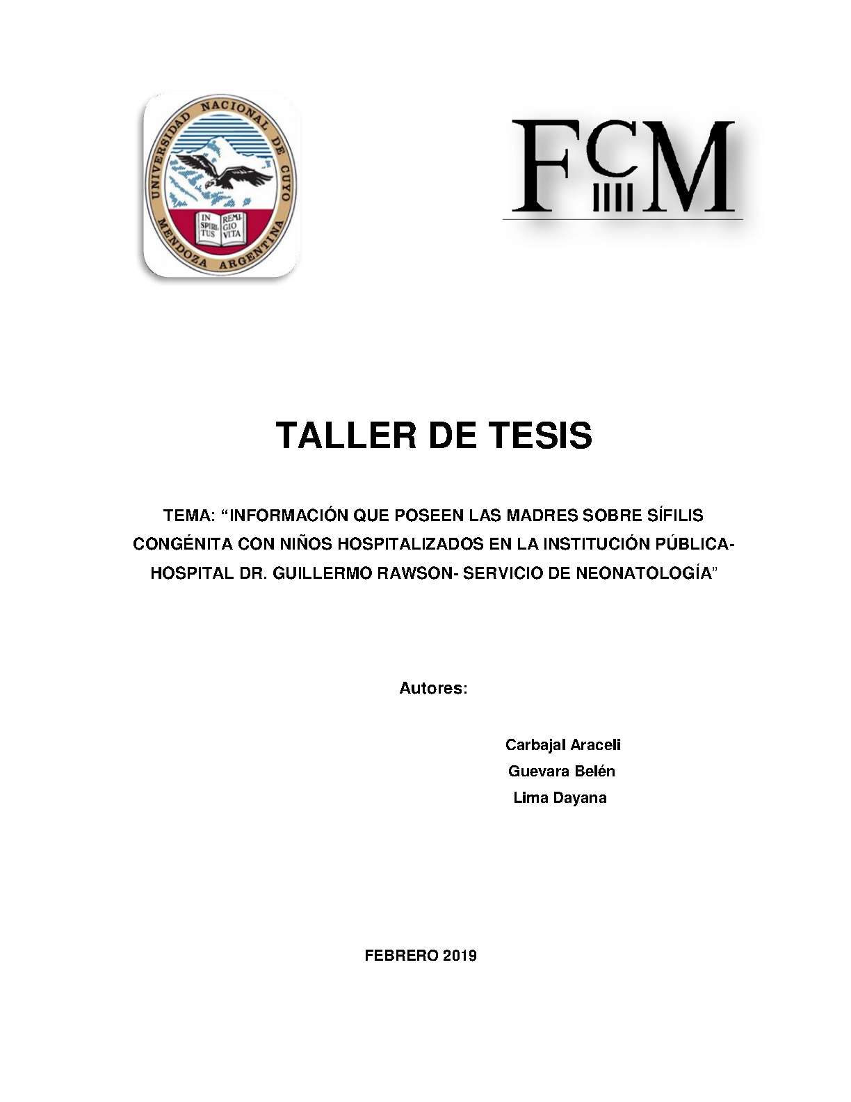 Carbajal, Araceli; Guevara, Belén; Lima, Dayana. (2019). Información que poseen las madres sobre sífilis congénita con niños hospitalizados en la institución pública-Hospital Dr. Guillermo Rawson- Servicio de Neonatología: (Tesina de grado). Mendoza, Universidad Nacional de Cuyo. Facultad de Ciencias Médicas. Escuela de Enfermería..