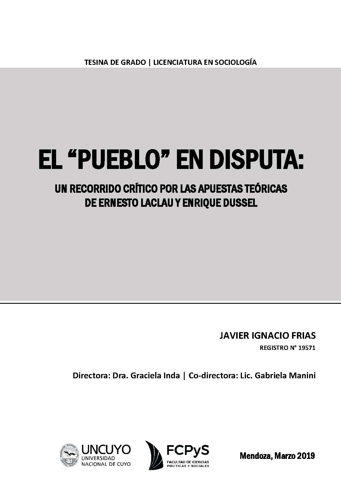 Frías, Javier Ignacio. (2019). El "pueblo" en disputa: un recorrido crítico por las apuestas teóricas de Ernesto Laclau y Enrique Dussel (Tesina de grado). Mendoza, Universidad Nacional de Cuyo. Facultad de Ciencias Políticas y Sociales .