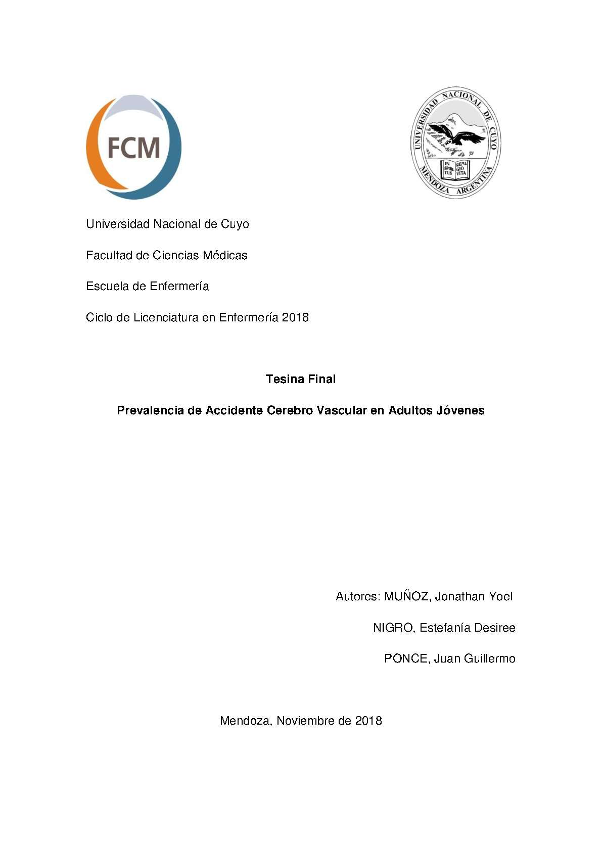 Muñoz, Jonathan Yoel; Nigro, Estefanía Desiree; Ponce, Juan Guillermo. (2018). Prevalencia de accidente cerebro vascular en adultos jóvenes: (Tesina de grado). Mendoza, Universidad Nacional de Cuyo. Facultad de Ciencias Médicas. Escuela de Enfermería..