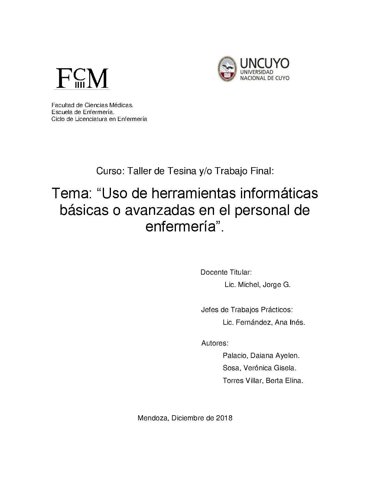 Palacio, Daiana Ayelén; Torres Villar, Berta Elina. (2018). Uso de herramientas informáticas básicas o avanzadas en el personal de enfermería: (Tesina de grado). Mendoza, Universidad Nacional de Cuyo. Facultad de Ciencias Médicas. Escuela de Enfermería..