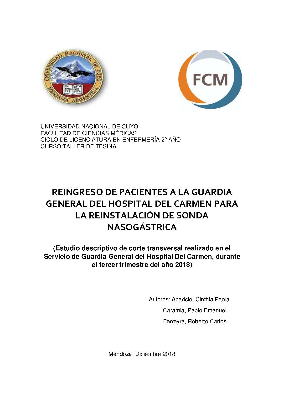Reingreso de pacientes a la guardia general del Hospital del Carmen para la reinstalación de sonda nasogástrica