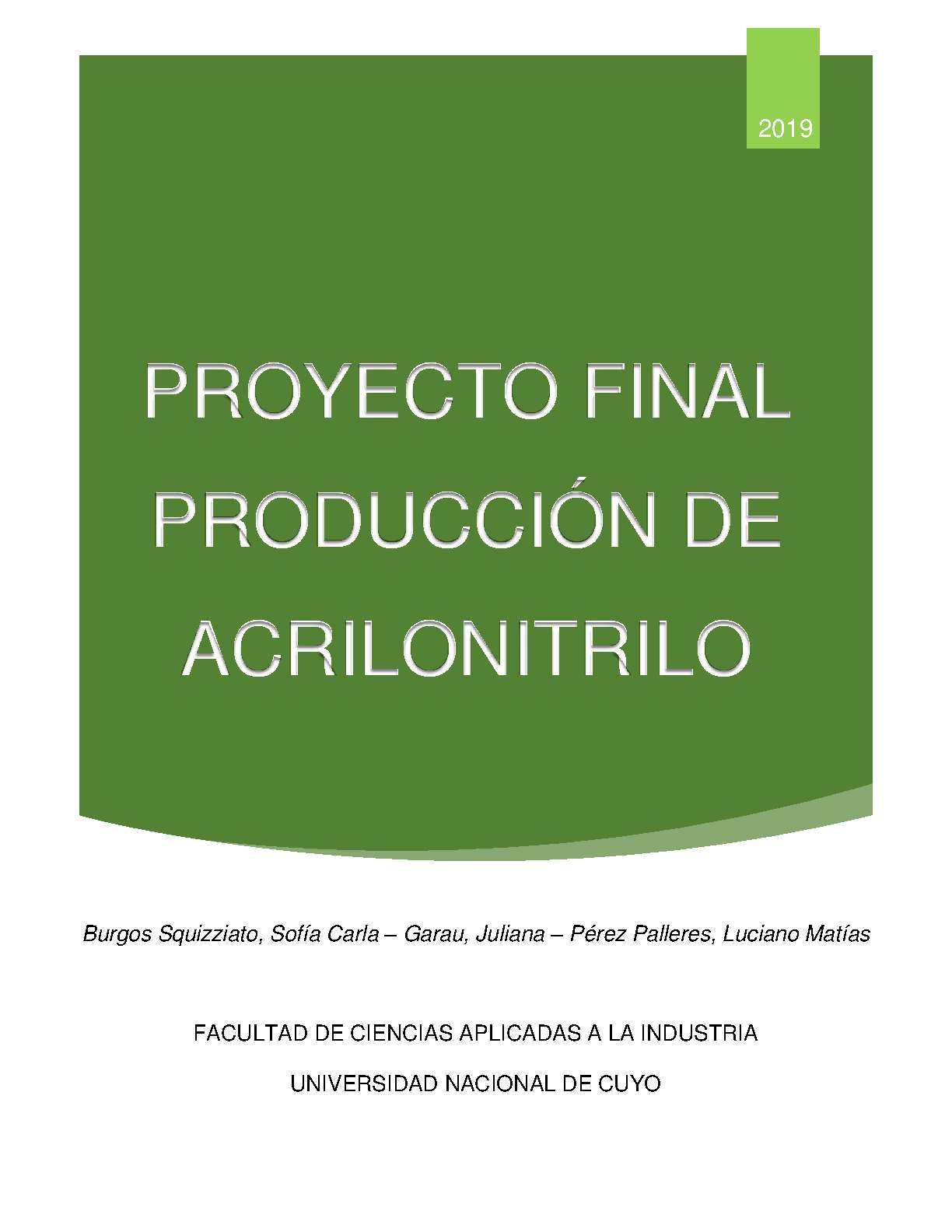 Burgos Squizziato, Sofía Carla; Garau, Juliana; Pérez Palleres, Luciano Matías. (2019). Producción de acrilonitrilo: (Trabajo final de grado). Mendoza, Universidad Nacional de Cuyo. Facultad de Ciencias Aplicadas a la Industria .