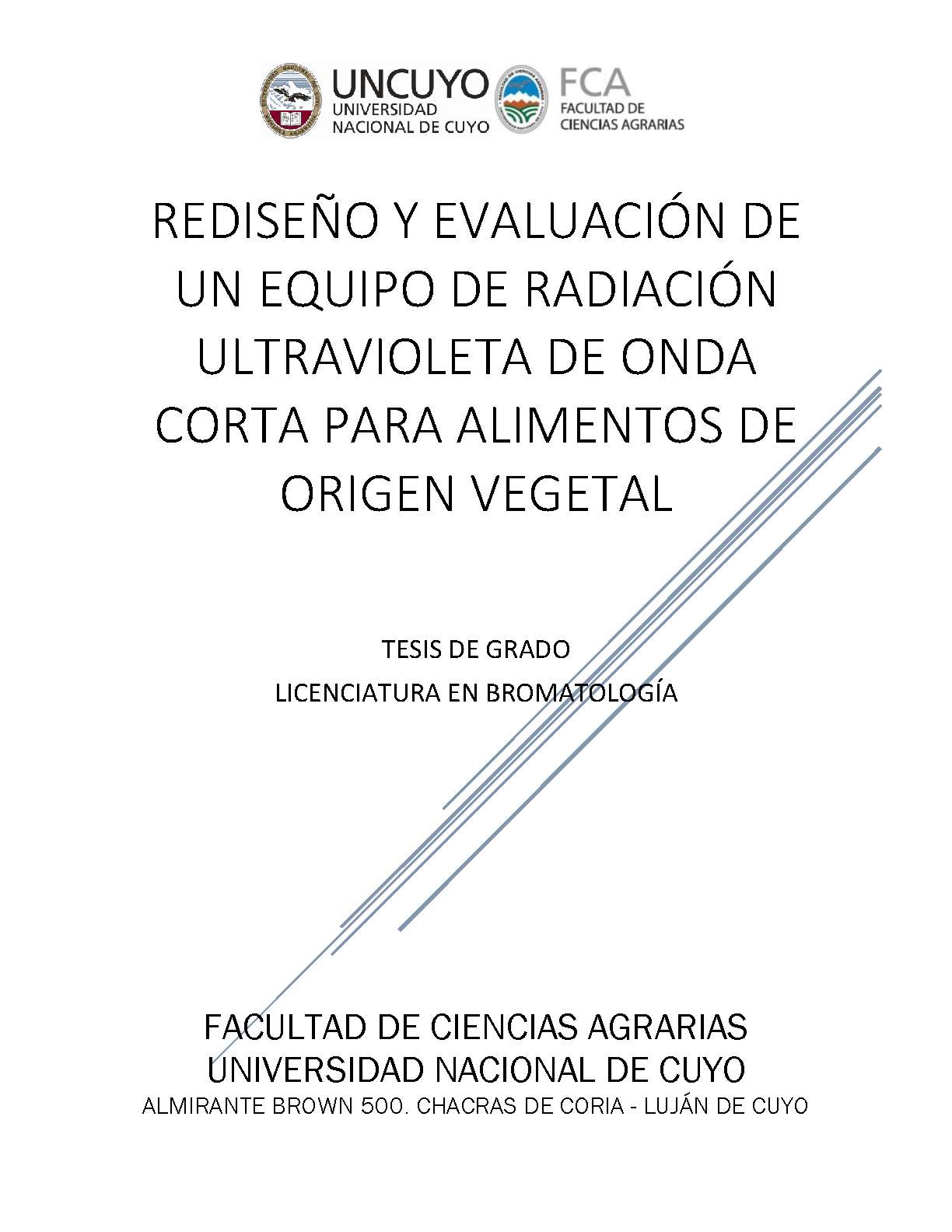 Martín, Vanesa Noemí. (2019). Rediseño y evaluación de un equipo de radiación UV-C para alimentos de origen vegetal: (Tesina de grado). Mendoza, Universidad Nacional de Cuyo. Facultad de Ciencias Agrarias .