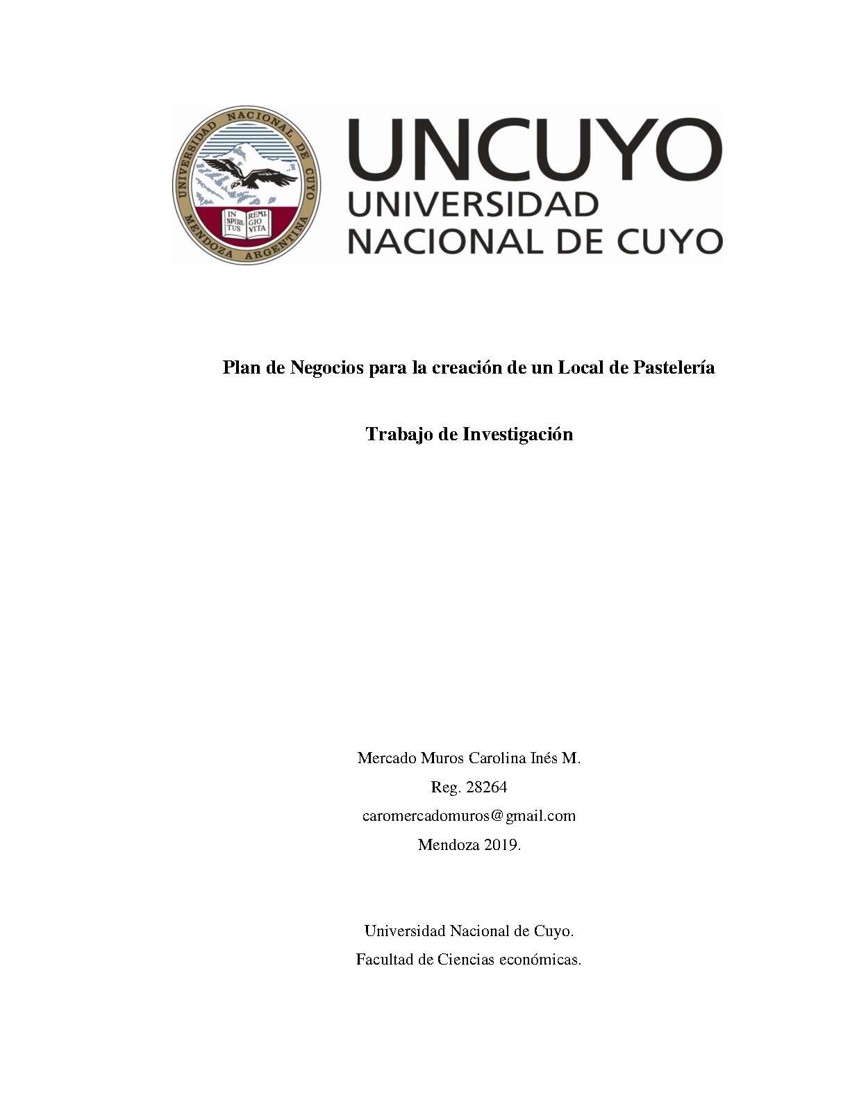 Mercado Muros, Carolina Inés M.. (2019). Plan de negocios para la creación de un local de pastelería: (Tesina de grado). Mendoza, Universidad Nacional de Cuyo. Facultad de Ciencias Económicas.