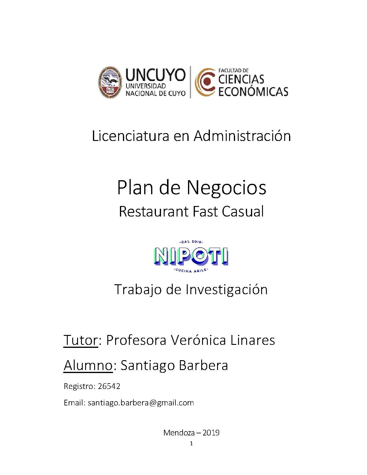 Barbera, Santiago. (2019). Plan de negocios restaurant fast casual: (Tesina de grado). Mendoza, Universidad Nacional de Cuyo. Facultad de Ciencias Económicas.