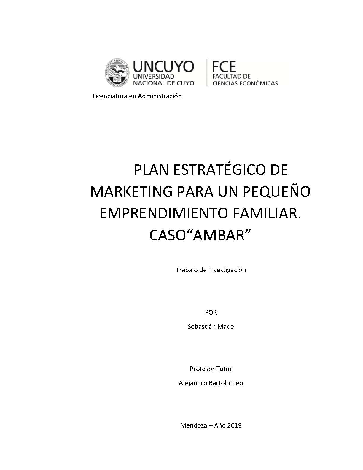 Este trabajo de investigación comprende el desarrollo de un Plan Estratégico de Marketing a implementarse durante el año 2019 para Ámbar, un pequeño emprendimiento familiar dedicado a la comercialización de frutos secos, cereales y otros alimentos naturales en el Gran Mendoza.