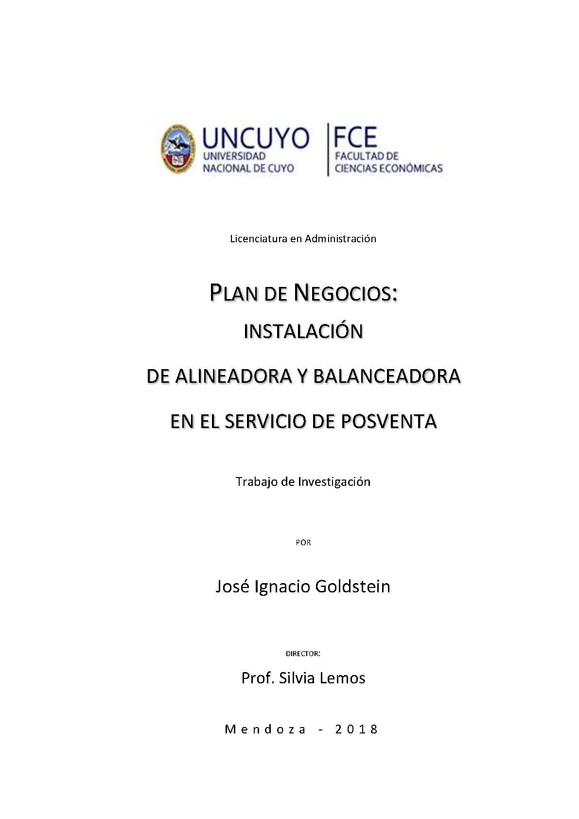 Goldstein, José Ignacio. (2018). Plan de negocios: instalación de alineadora y balanceadora en el servicio de posventa (Tesina de grado). Mendoza, Universidad Nacional de Cuyo. Facultad de Ciencias Económicas.