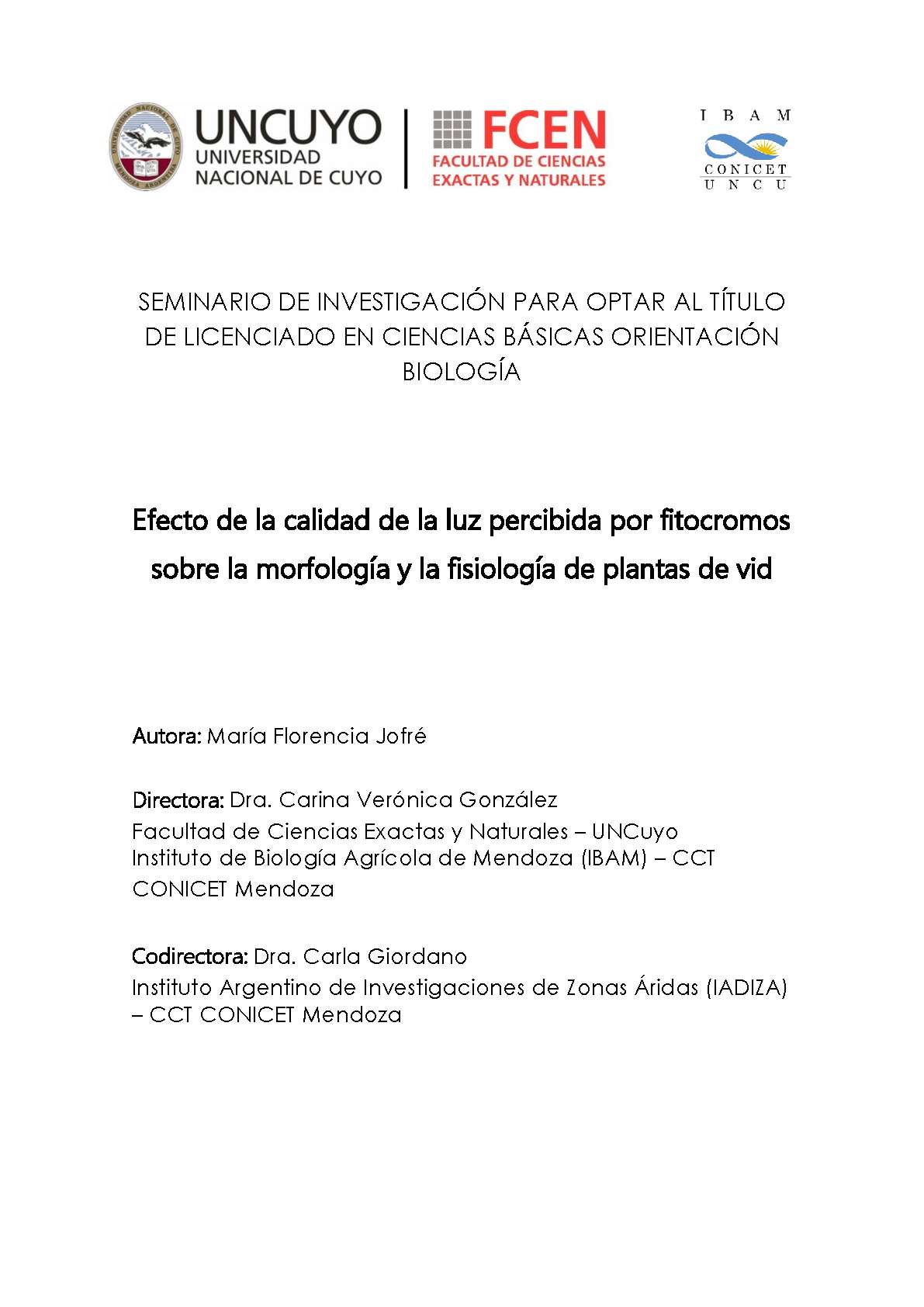 Jofré, María Florencia. (2016). Efecto de la calidad de la luz percibida por fitocromos sobre la morfología y la fisiología de plantas de vid: (Tesina de grado). Mendoza, Universidad Nacional de Cuyo. Facultad de Ciencias Exactas y Naturales.