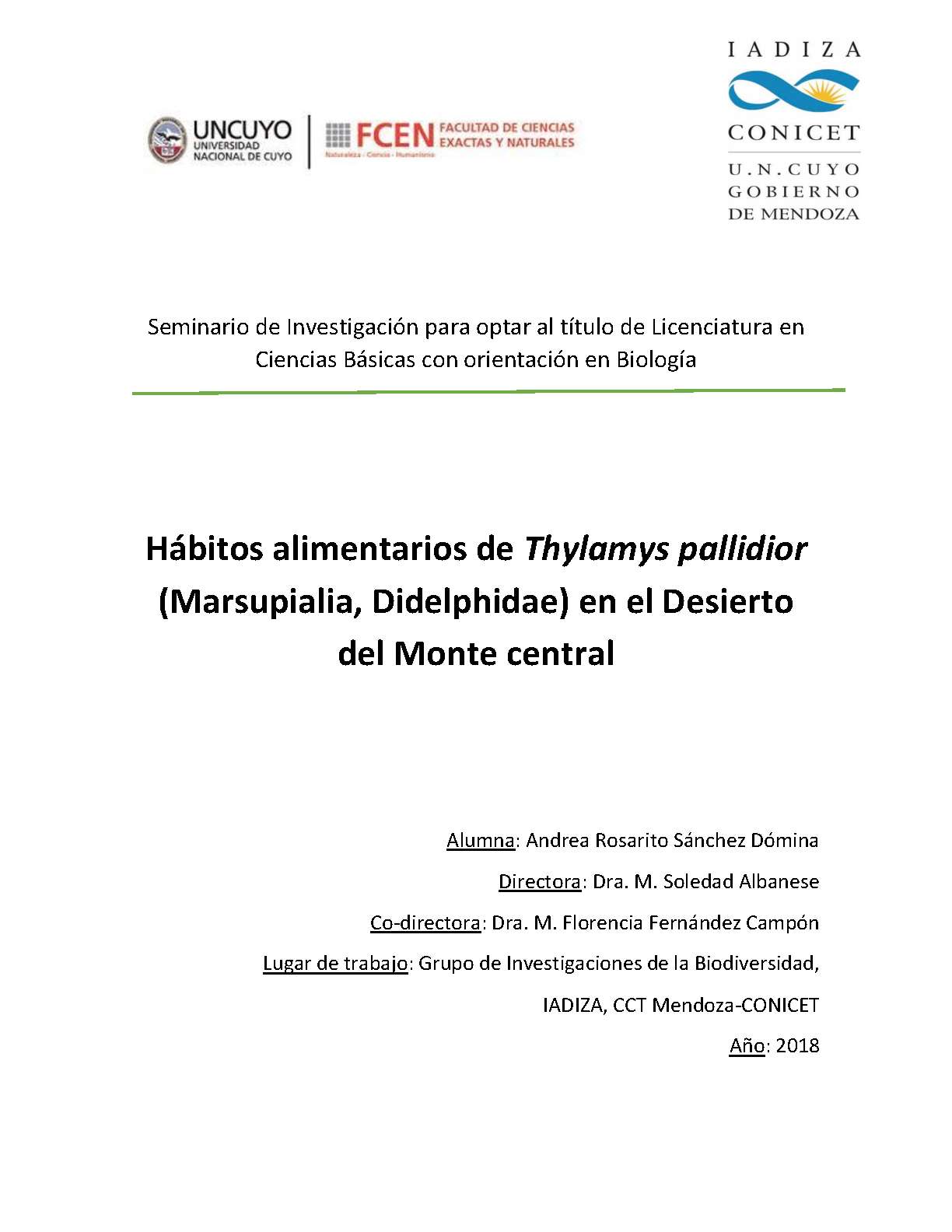 El presente trabajo propone estudiar la estrategia alimentaria de hábitos alimentarios, especie marsupial que habita en el desierto del Monte y cuya dieta presenta muy poca variabilidad estacional y está compuesta por 70% artrópodos y 30% material vegetal. Los objetivos planteados en esta tesina implican caracterizar y cuantificar la dieta de T. pallidior, describir la variación de recursos alimentarios (plantas y artrópodos) en relación al régimen de precipitaciones, evaluar la dieta en función de la disponibilidad y determinar si existen cambios estacionales en la selección de dieta y amplitud de nicho. El trabajo fue llevado a cabo en la Reserva de Biósfera Ñacuñan, Santa Rosa, Mendoza. Se tuvieron en cuenta muestreos realizados durante 2014 y 2016.