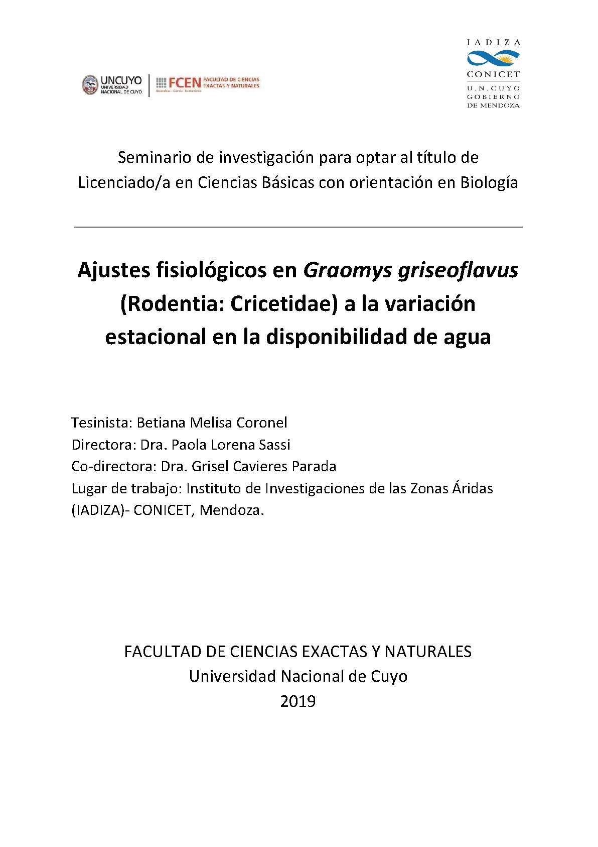 Coronel, Betiana Melisa. (2019). Ajustes fisiológicos en Graomys griseoflavus (rodentia: cricetidae) a la variación estacional en la disponibilidad de agua.: (Tesina de grado). Mendoza, Universidad Nacional de Cuyo. Facultad de Ciencias Exactas y Naturales.