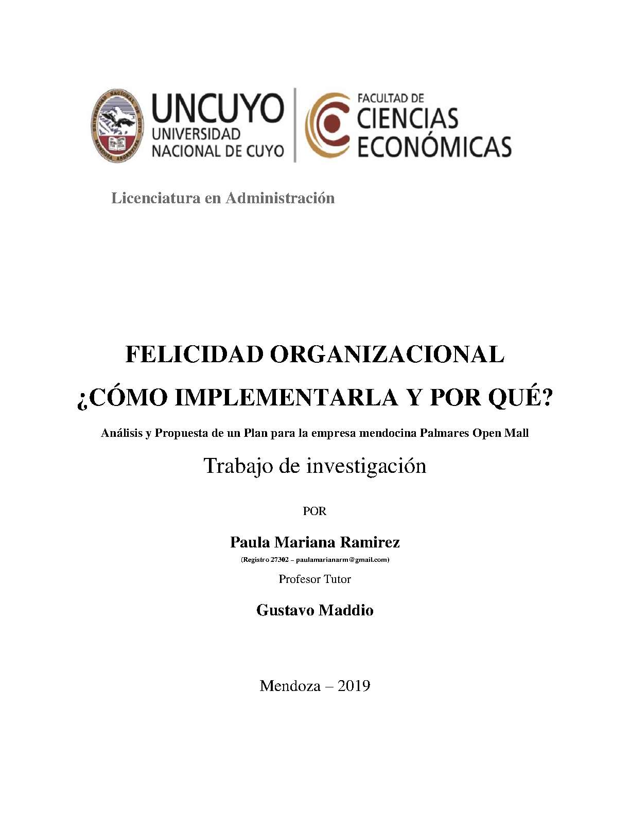 El objetivo de la investigación consiste en poder determinar y comprobar los beneficios de implementar Felicidad Organizacional en las organizaciones. Se busca determinar si, mediante una gestión basada en felicidad, es posible agregar valor a la organización. Para ello, también se analiza el caso de una empresa mendocina, Open Mall S.A., conoceremos su situación actual en gestión y elementos de Recursos Humanos mediante una investigación basada en encuestas y entrevistas, y brindaremos un plan para la aplicación y desarrollo de la Felicidad Organizacional en esta compañía con el fin de mejorar el desempeño y bienestar de los colaboradores.