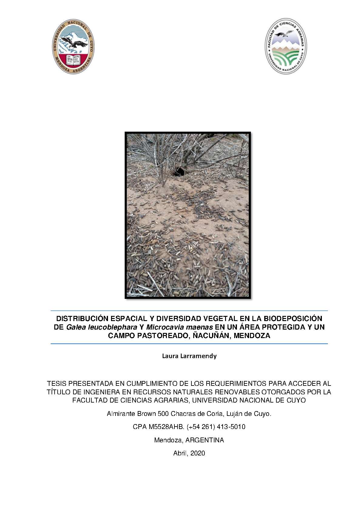 Larramendy, Laura Ailén. (2019). Distribución espacial y diversidad vegetal en la biodeposición de Galea leucoblephara y Microcavia maenas en un área protegida y un campo pastoreado, Ñacuñán, Mendoza: (Tesina de grado). Mendoza, Universidad Nacional de Cuyo. Facultad de Ciencias Agrarias .
