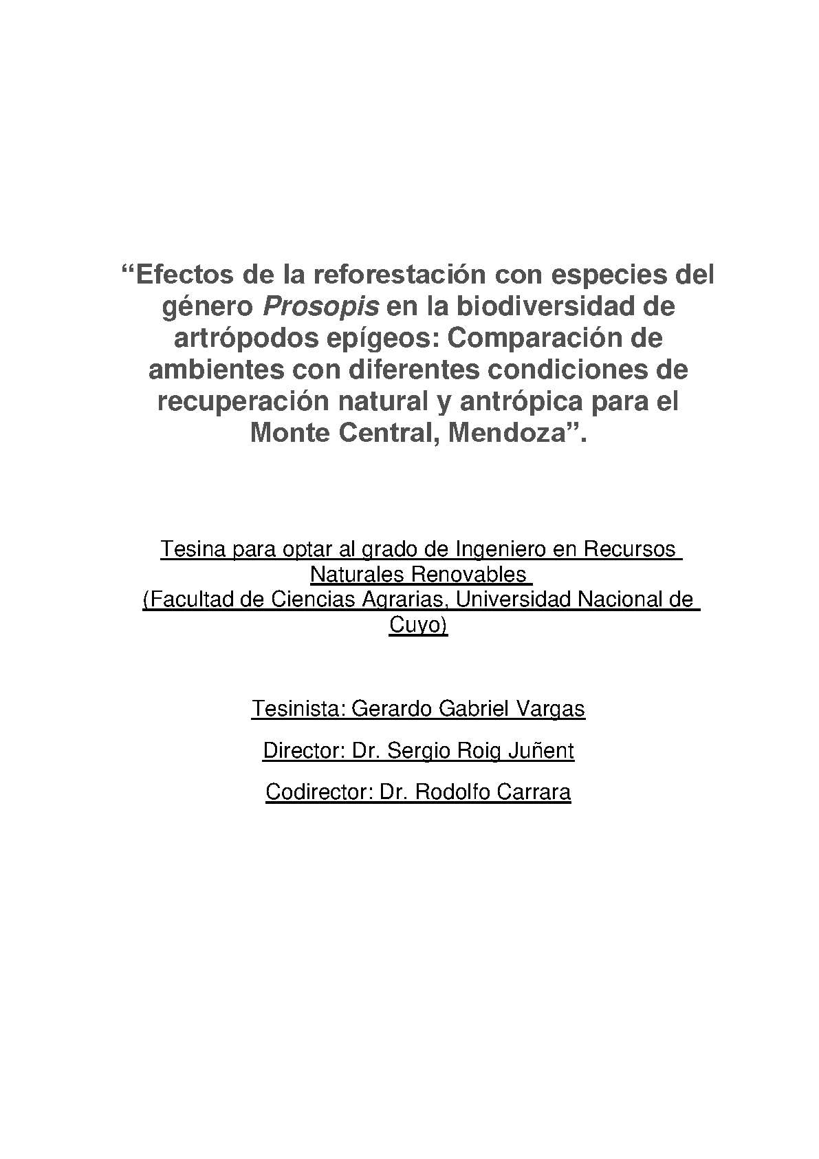 El objetivo de esta tesina es determinar si la reforestación con especímenes arbóreos de Prosopis, influye en la diversidad y composición de los artrópodos que viven en el suelo tanto a escala local, bajo la canopia como la intercanopia y a escala regional comparándolo con otras comunidades presentes en la ecorregión, entre ellas matorral de Larrea divaricata, campos que han sido quemados y bosques de Prosopis preservados.