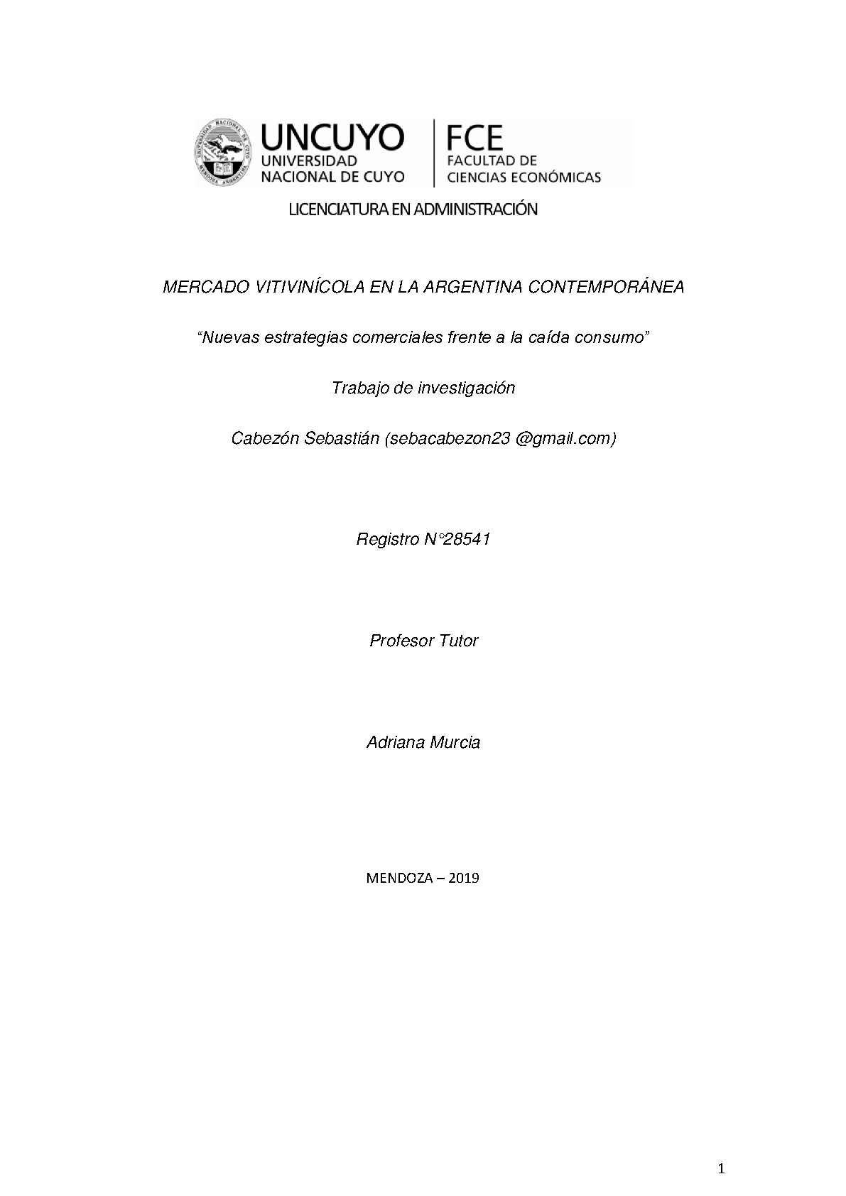 Cabezón, Sebastián. (2019). Mercado vitivinícola en la Argentina contemporánea: nuevas estrategias comerciales frente a la caída consumo (Tesina de grado). Mendoza, Universidad Nacional de Cuyo. Facultad de Ciencias Económicas.