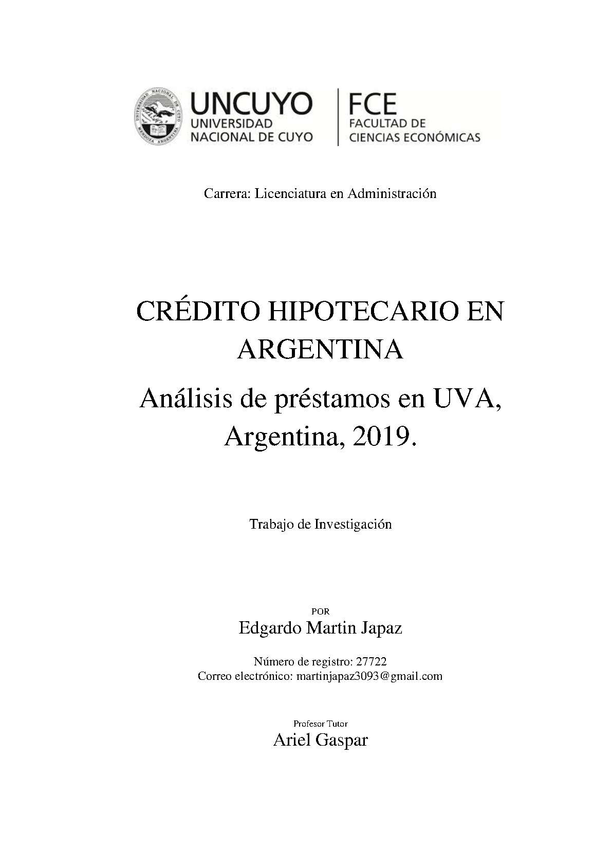 Japaz, Edgardo Martín. (2019). Crédito hipotecario en Argentina: análisis de préstamos en UVA, Argentina, 2019 (Tesina de grado). Mendoza, Universidad Nacional de Cuyo. Facultad de Ciencias Económicas.