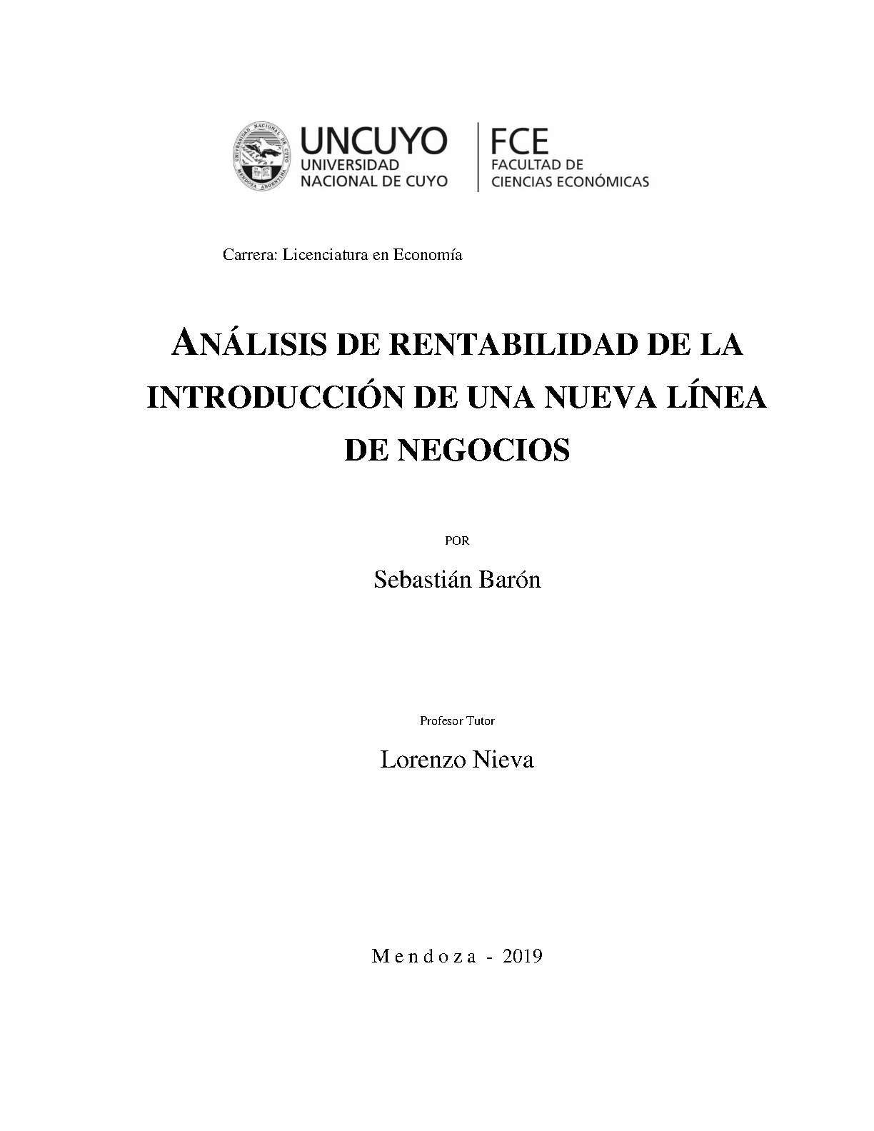 Barón, Sebastián. (2019). Análisis de rentabilidad de la introducción de una nueva línea de negocios: (Tesina de grado). Mendoza, Universidad Nacional de Cuyo. Facultad de Ciencias Económicas.