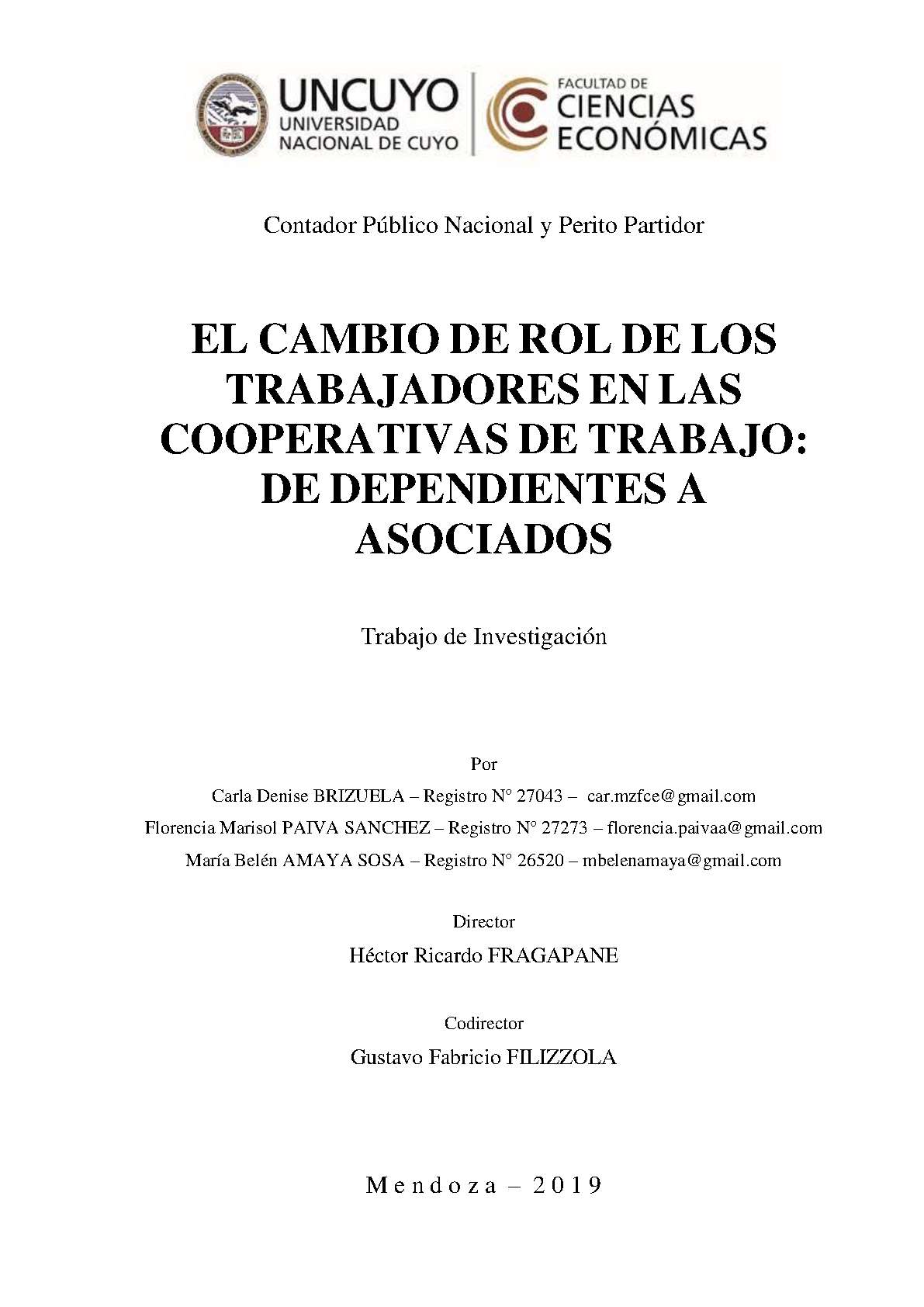 El presente trabajo de investigación se denomina “El cambio de rol de los trabajadores en las cooperativas de trabajo: de dependientes a asociados" y se plantea en el contexto dado en la República Argentina.
