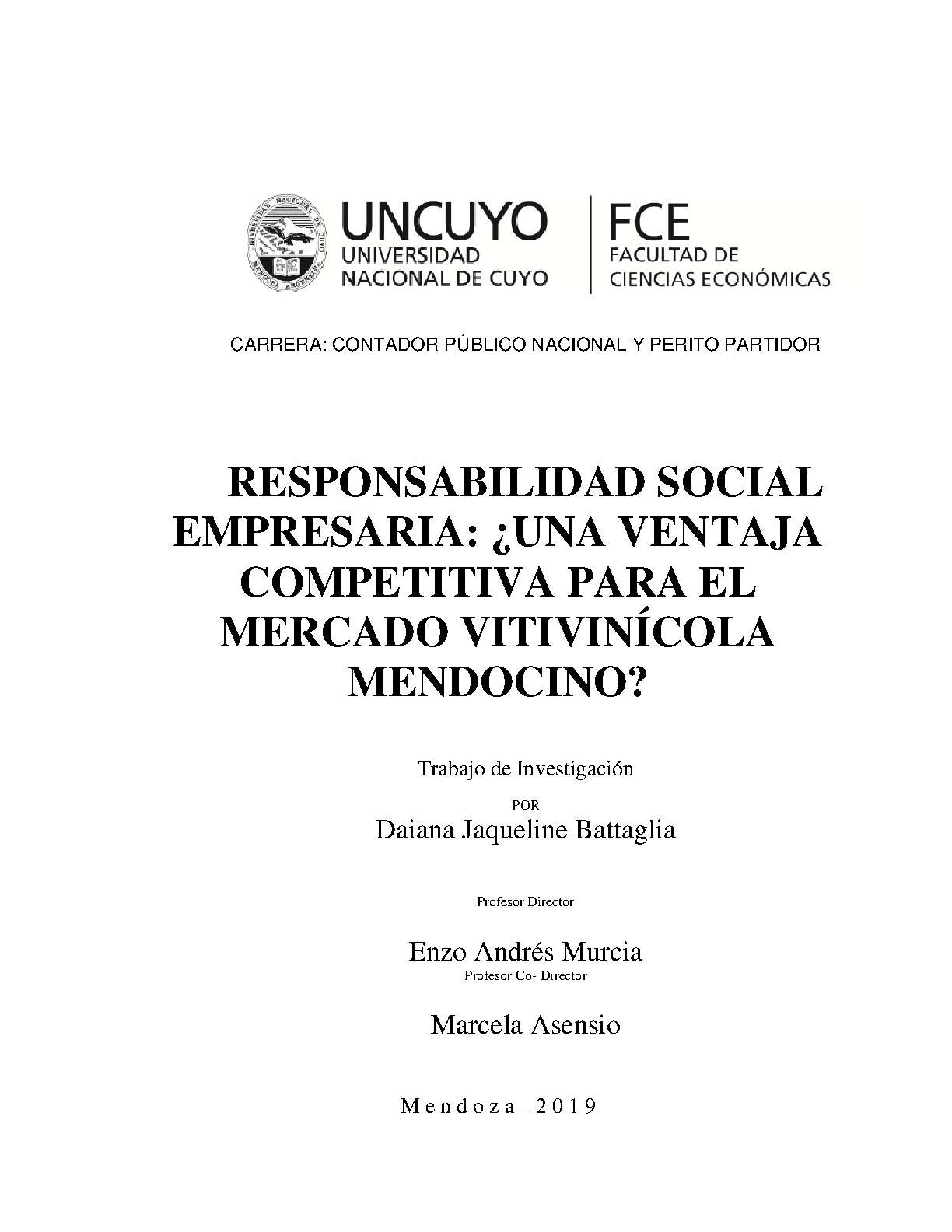 desde que desarrolla las medidas. La hipótesis planteada consiste en constatar si la adopción de medidas de RSE brinda ventajas competitivas a las bodegas que la aplican. El mismo consta de 3 capítulos, en el primero se define el tema objeto de tratamiento, se visualizan los antecedentes a nivel mundial, nacional y provincial y las normativas en cada una de las divisiones enunciadas. En el segundo se profundiza sobre