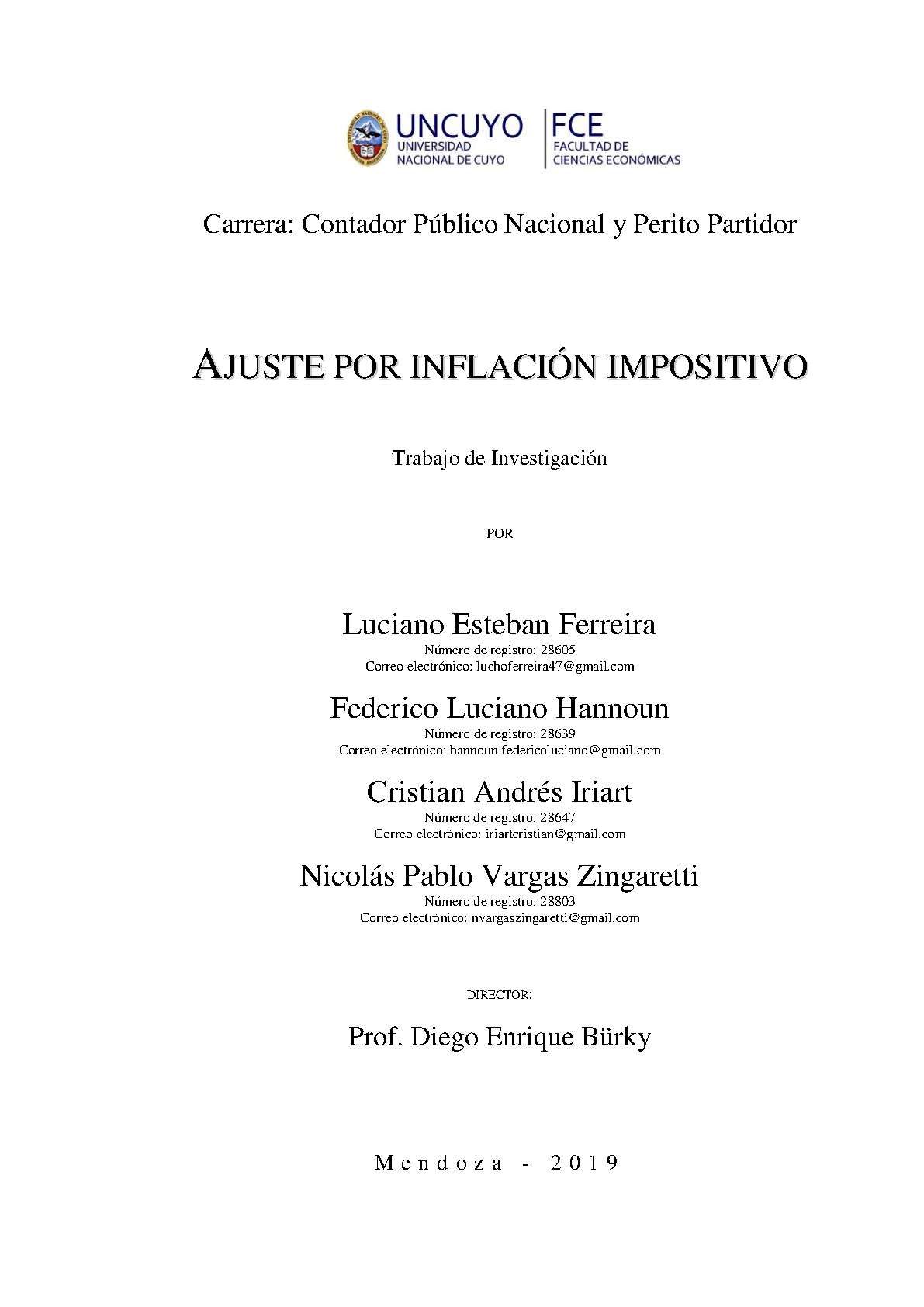 Ferreira, Luciano Esteban; Hannoun, Federico Luciano; Iriart, Cristian Andrés; Vargas Zingaretti, Nicolás Pablo. (2019). Ajuste por inflación impositivo: (Tesina de grado). Mendoza, Universidad Nacional de Cuyo. Facultad de Ciencias Económicas.