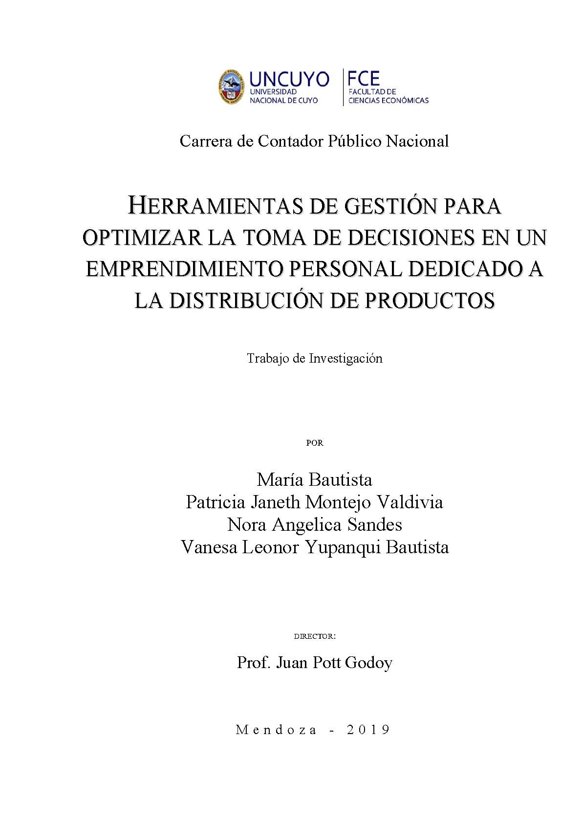 Bautista, María; Montejo Valdivia, Patricia Janeth; Sandes, Nora Angélica; Yupanqui Bautista, Vanesa Leonor. (2019). Herramientas de gestión para optimizar la toma de decisiones en un emprendimiento personal dedicado a la distribución de productos: (Tesina de grado). Mendoza, Universidad Nacional de Cuyo. Facultad de Ciencias Económicas.
